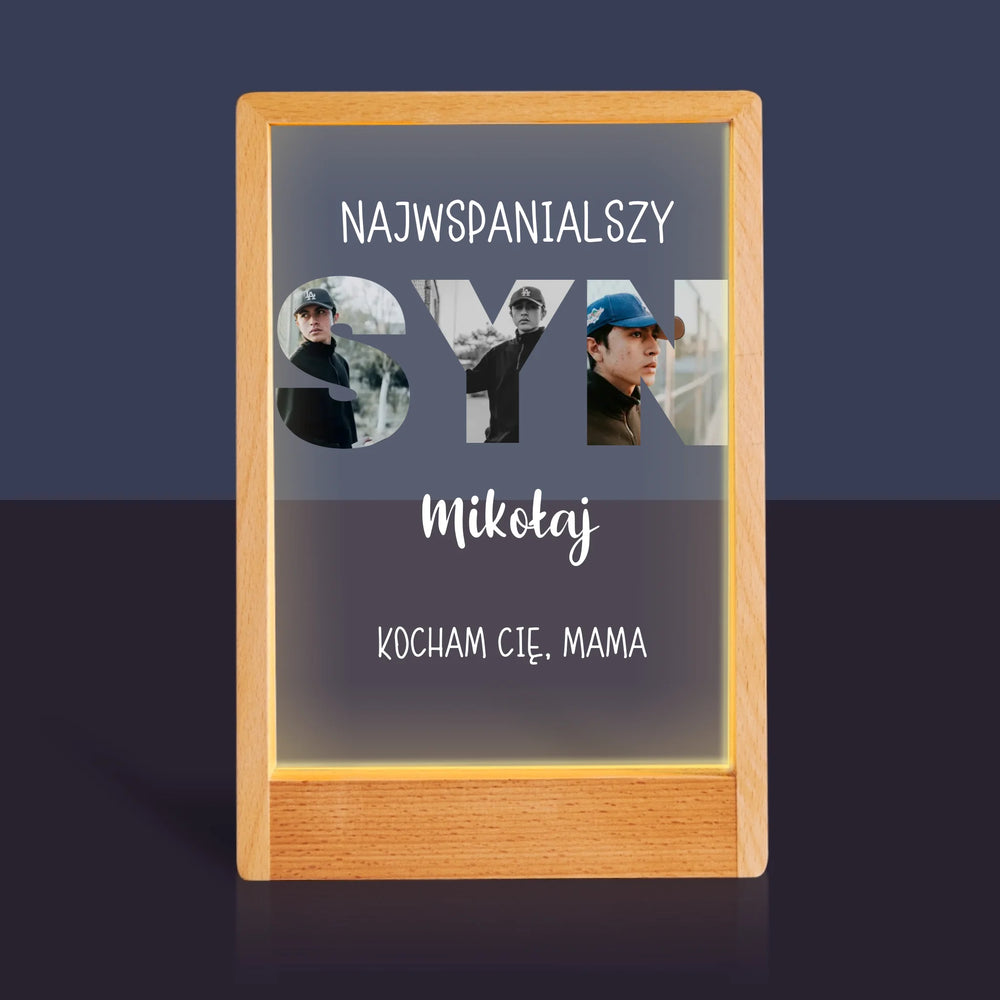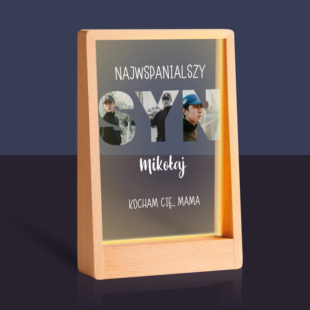 Słowo Ze Zdjęć: Syn - Wydruk na szkle akrylowym w ramce LED