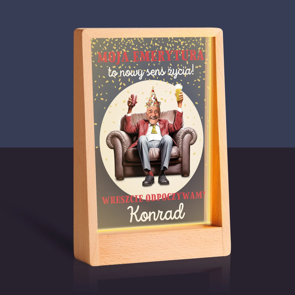 Twoja Postać: Emerytura To Sens Życia - Wydruk na szkle akrylowym w ramce LED
