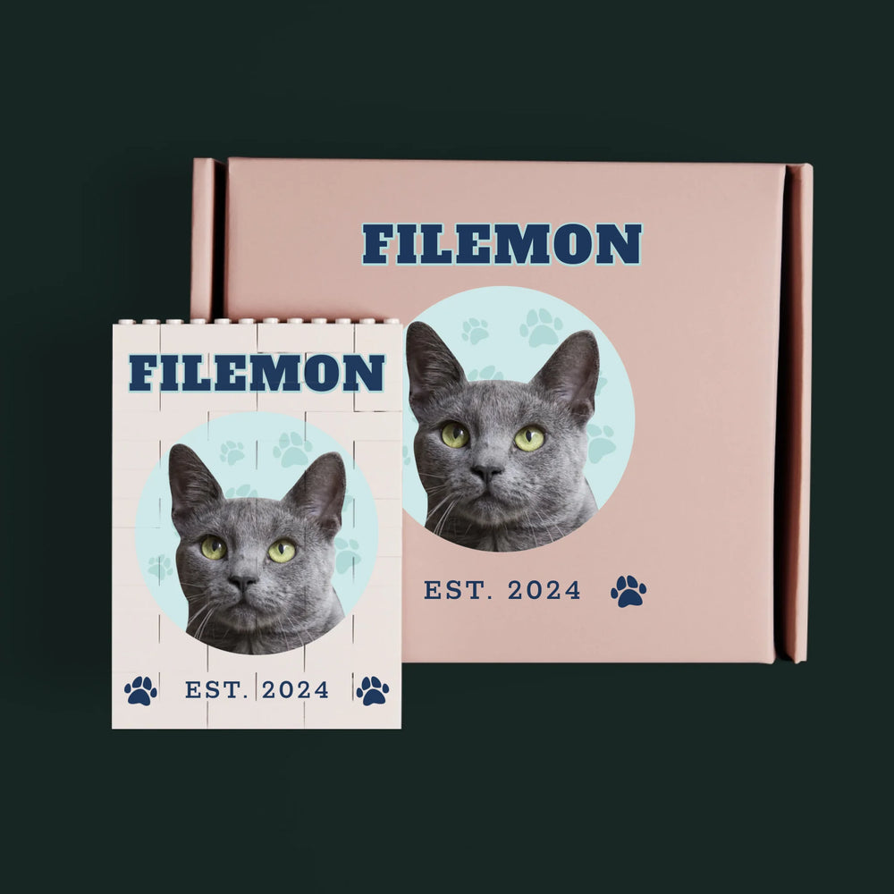Personalizowany nadruk na klockach oraz na beżowym pudełku.