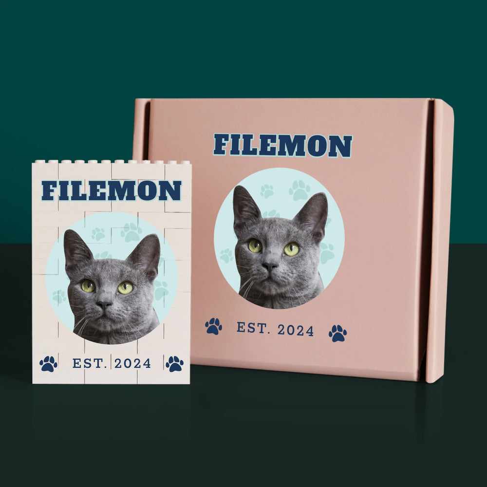 Personalizowany nadruk na klockach oraz na beżowym pudełku.
