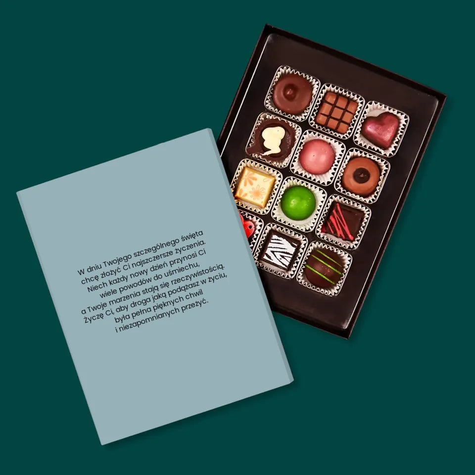Pyszne praliny z belgijskiej czekolady w eleganckim pudełku z wybraną przez Ciebie personalizacją.