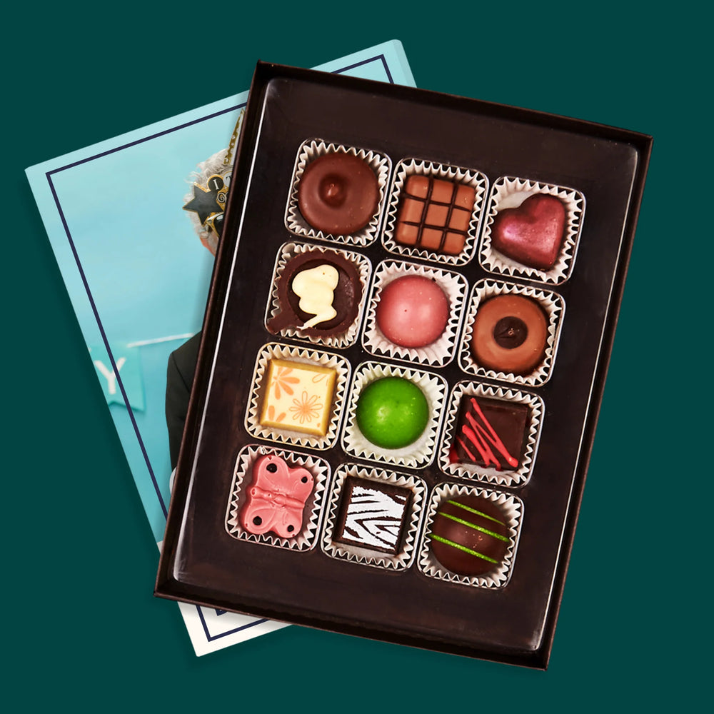 Pyszne praliny z belgijskiej czekolady w eleganckim pudełku z wybraną przez Ciebie personalizacją.