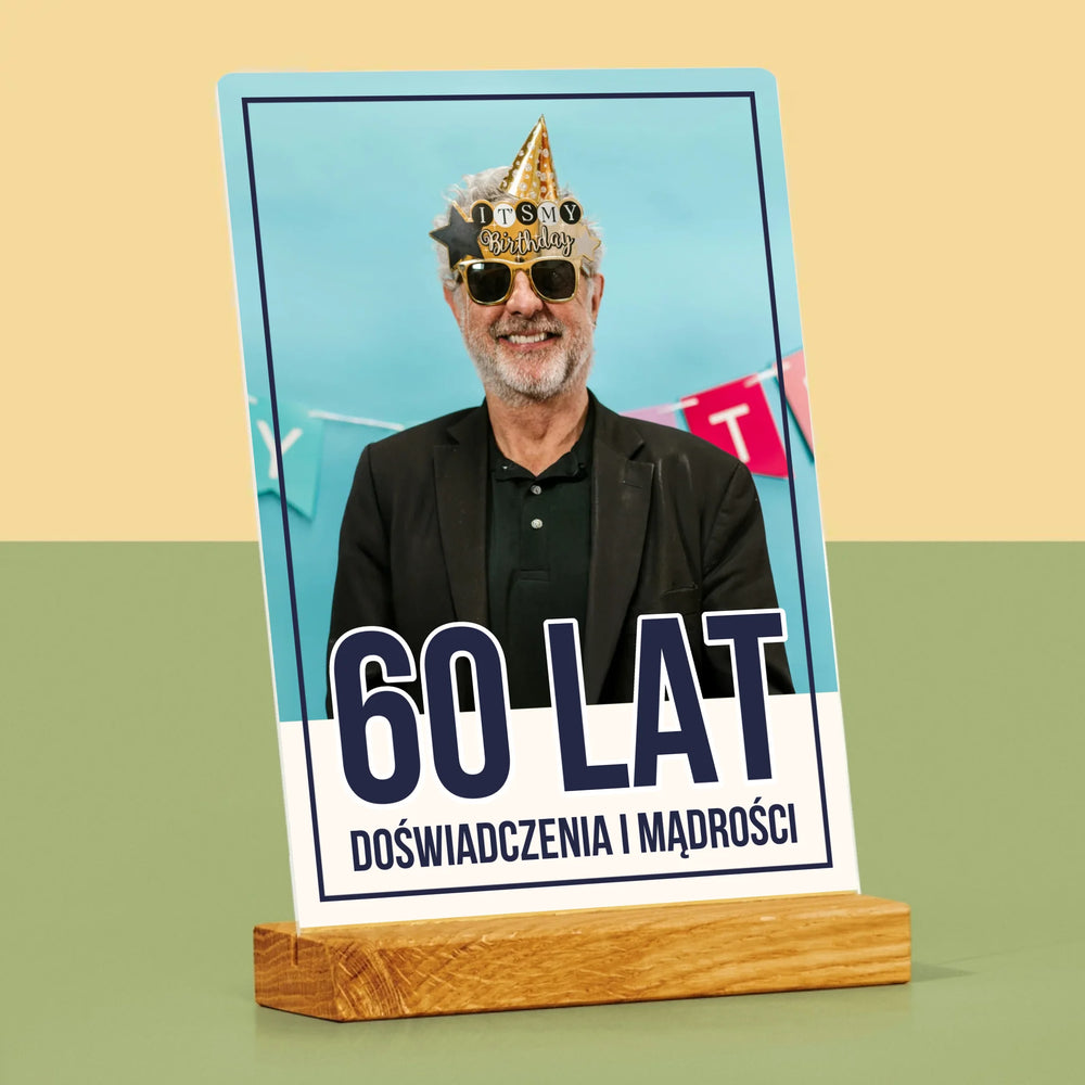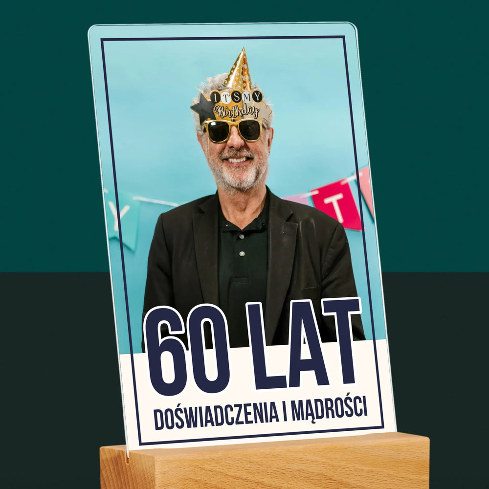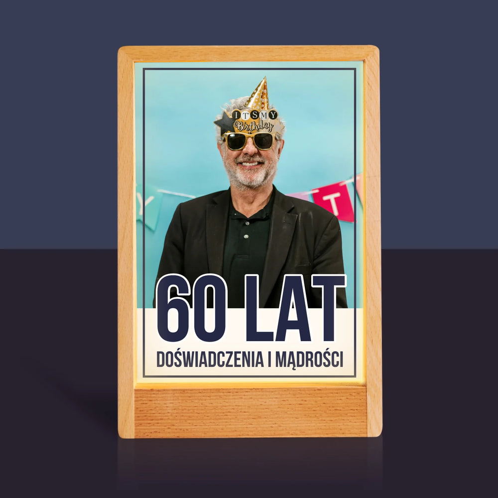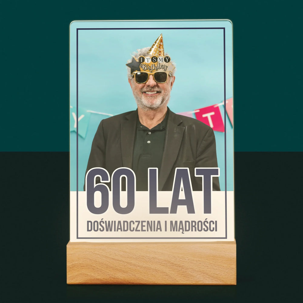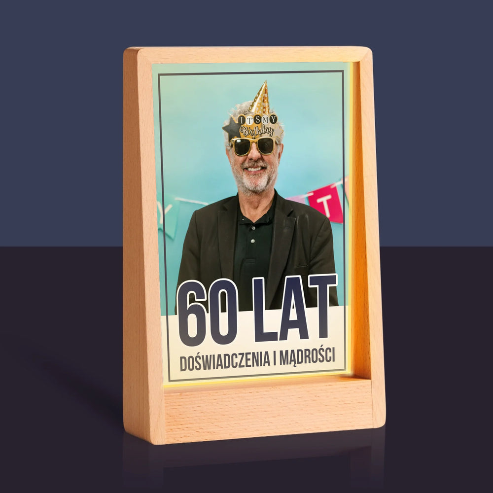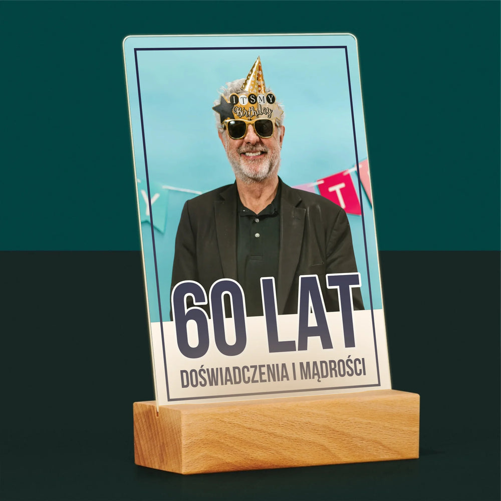 Zdjęcie i Podpis: 60 Lat Doświadczenia i Mądrości - Wydruk na szkle akrylowym w ramce LED