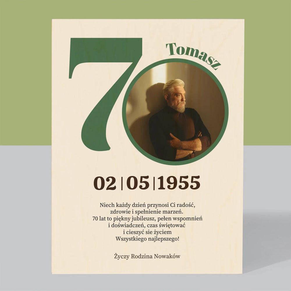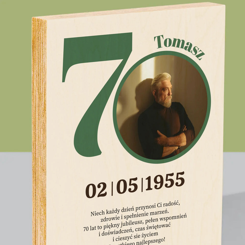 Zdjęcie I Podpis: 70 Urodziny Dedykacja - Wydruk na drewnie - Pion