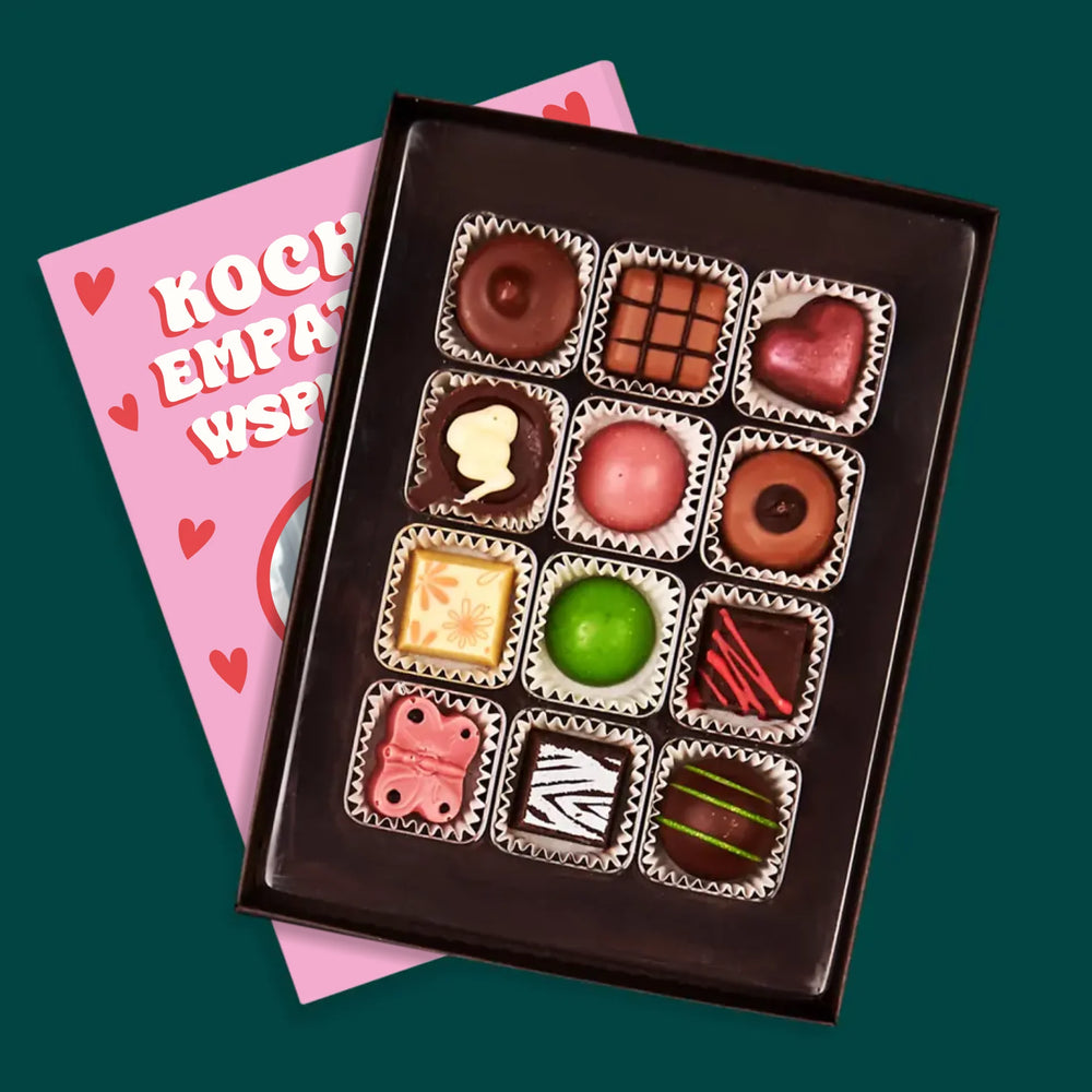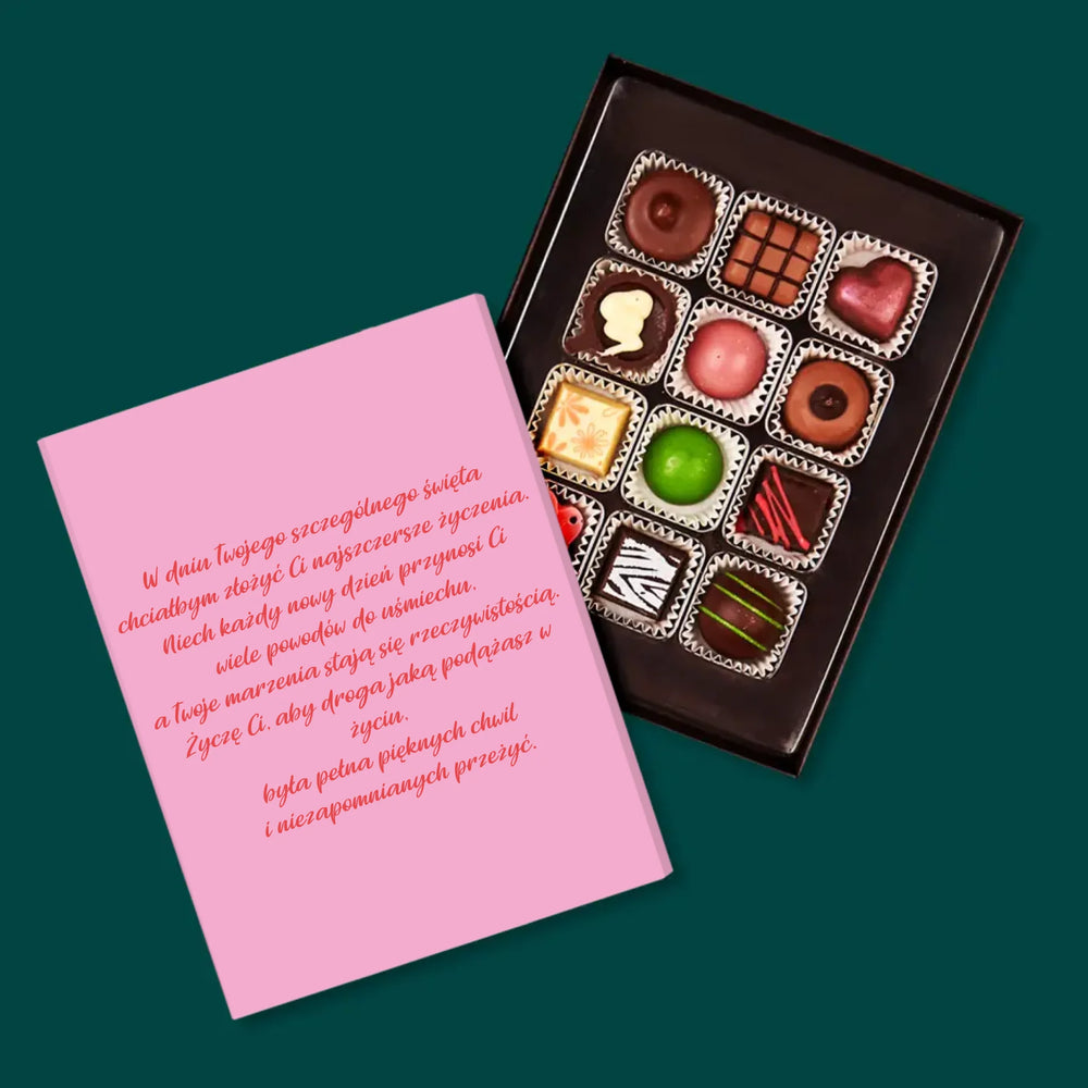 Pyszne praliny z belgijskiej czekolady w eleganckim pudełku z wybraną przez Ciebie personalizacją.