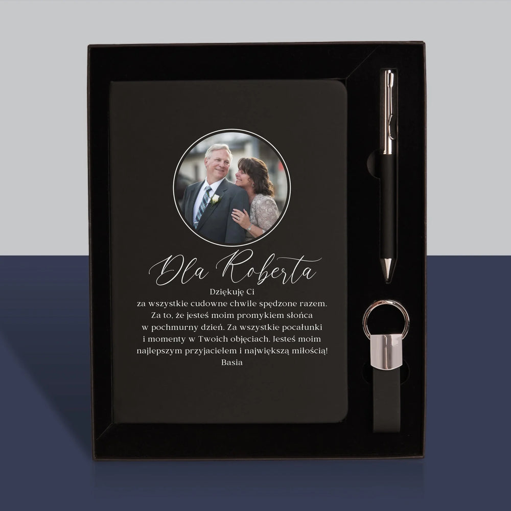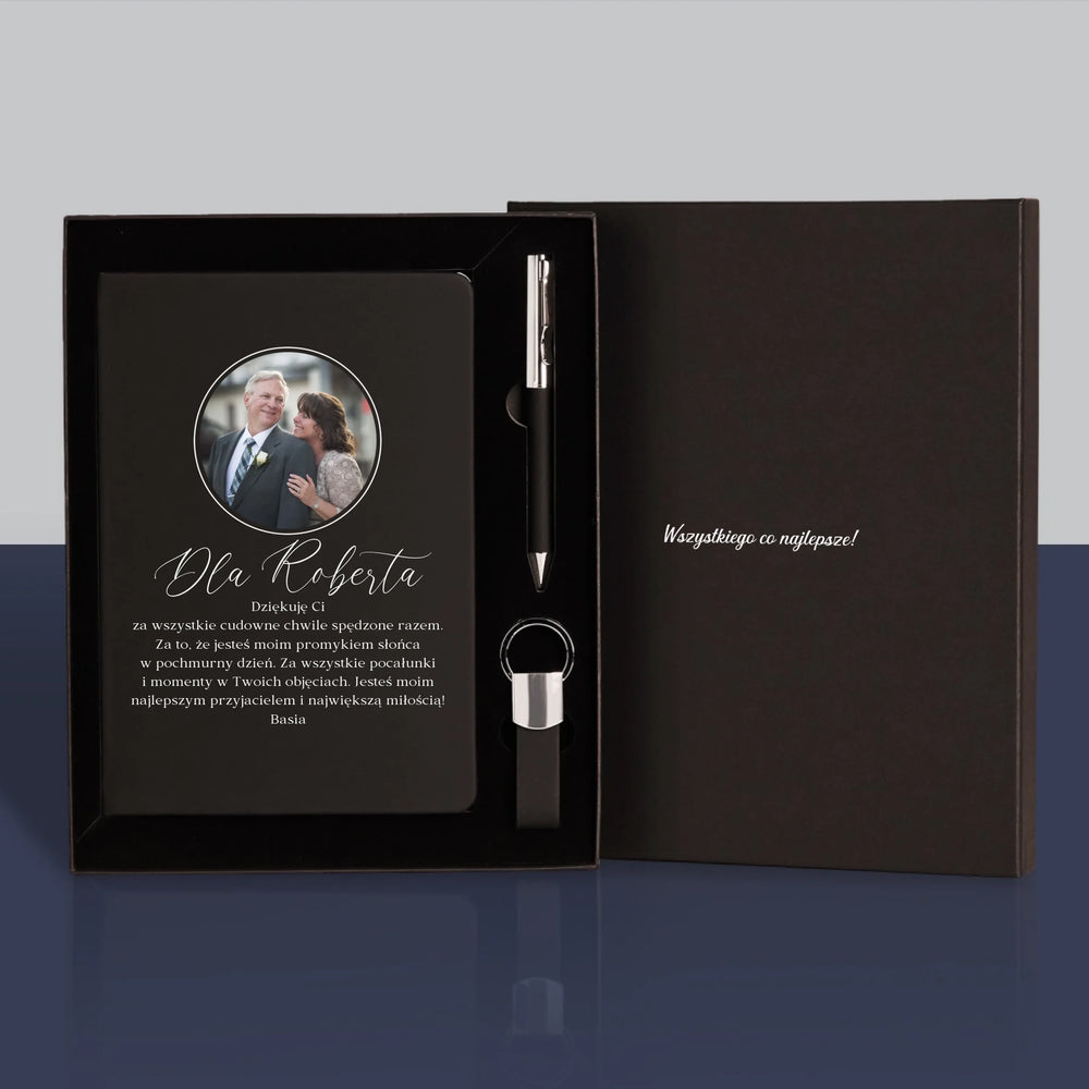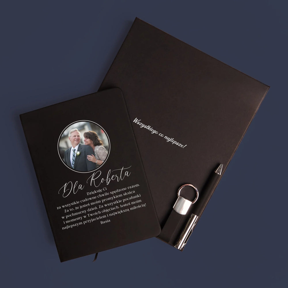 • Zestaw z eleganckim notatnikiem z wybraną przez Ciebie personalizacją na okładce.