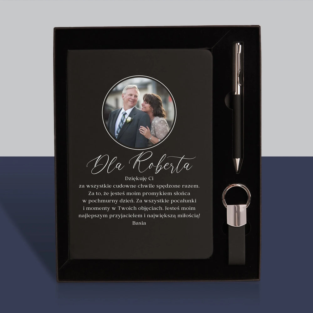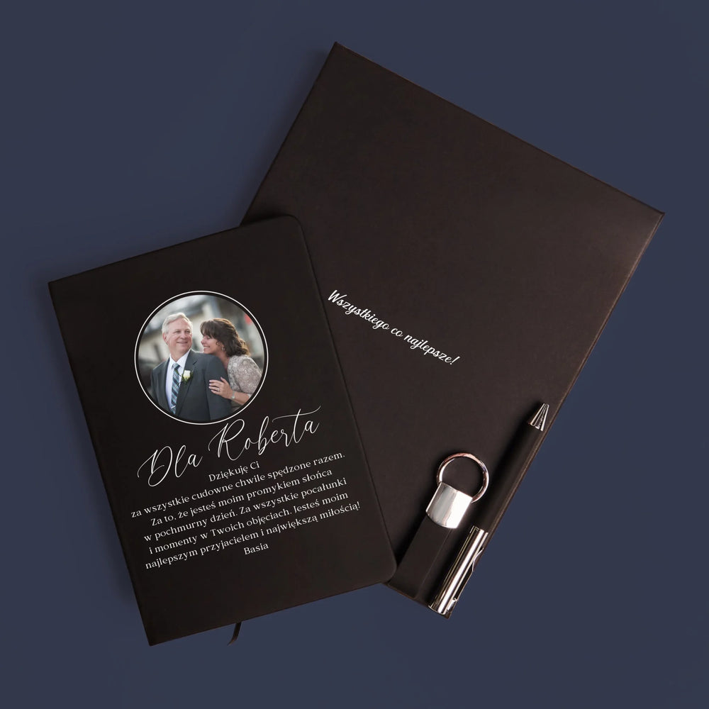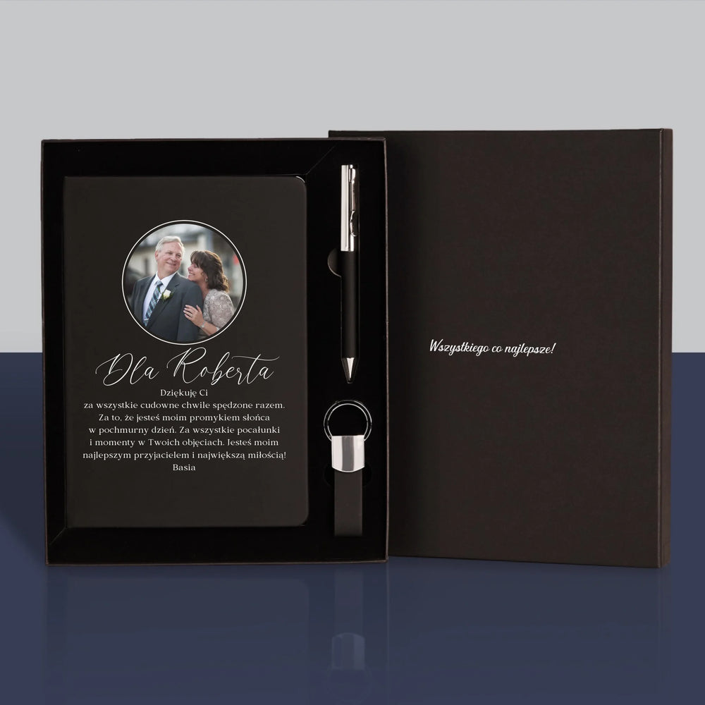Zestaw z eleganckim notatnikiem z wybraną przez Ciebie personalizacją na okładce.