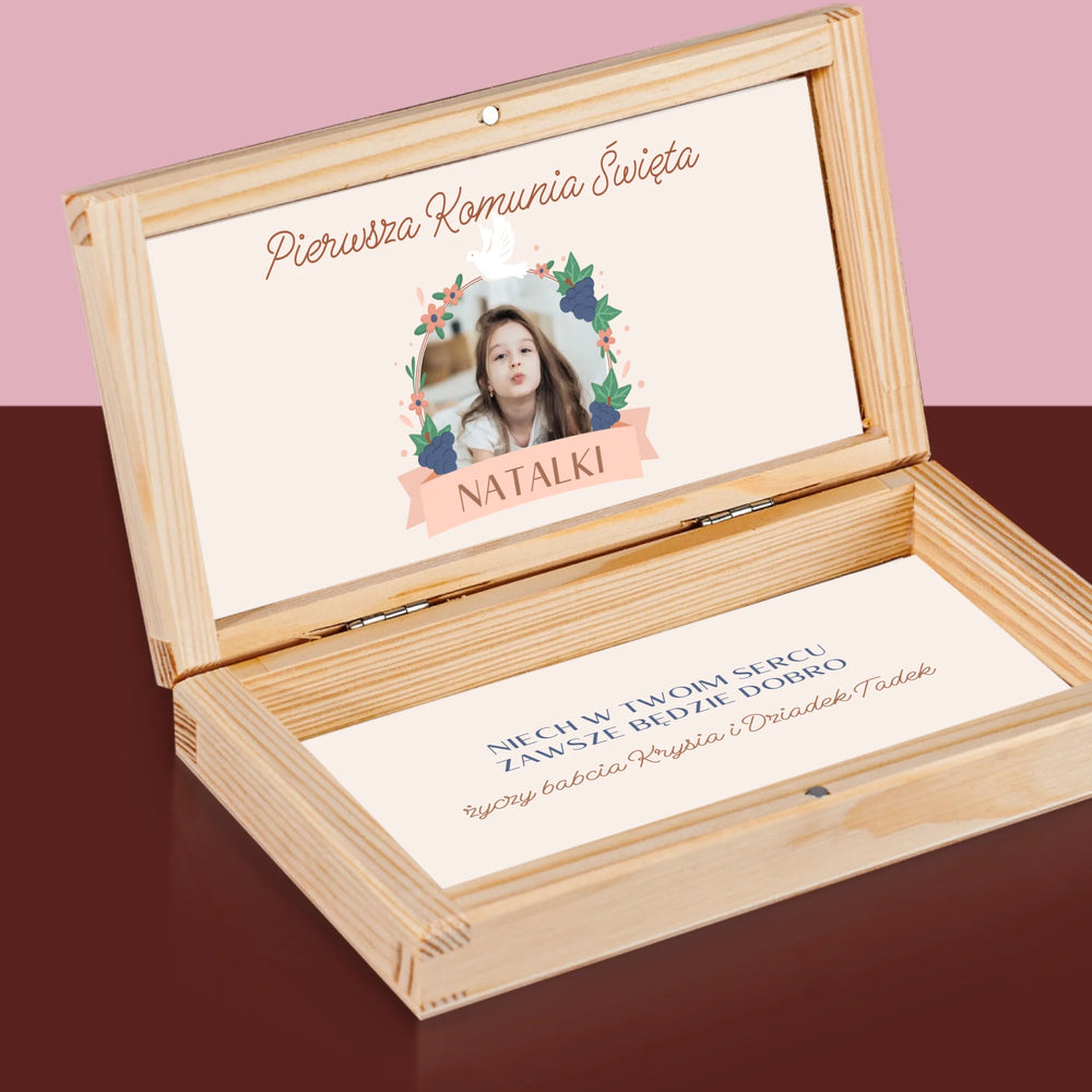 Zdjęcie i Podpis: Dobro w Sercu Komunia - Drewniane pudełko na pieniądze