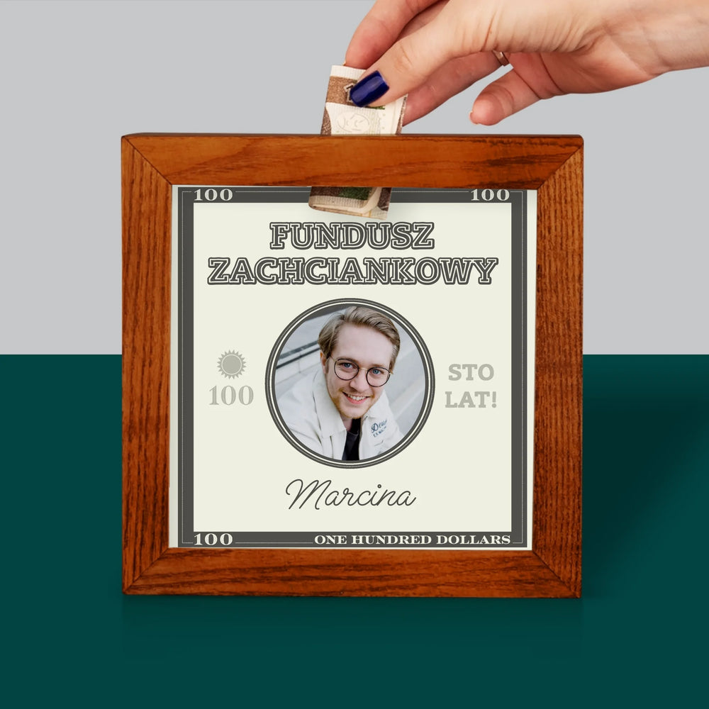 Zdjęcie I Podpis: Fundusz Zachciankowy - Drewniana skarbonka