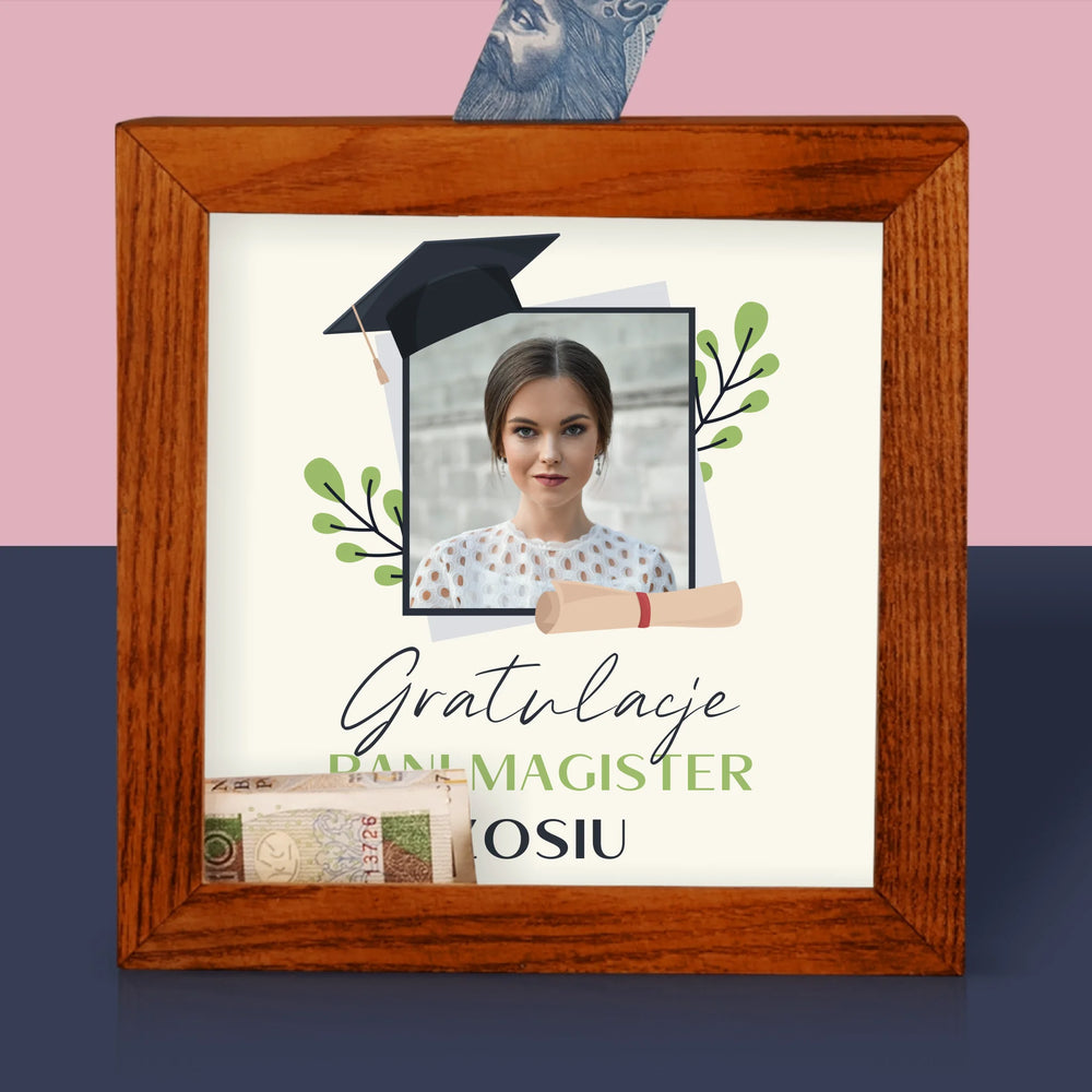 Zdjęcie I Podpis: Gratulacje Magister - Drewniana skarbonka