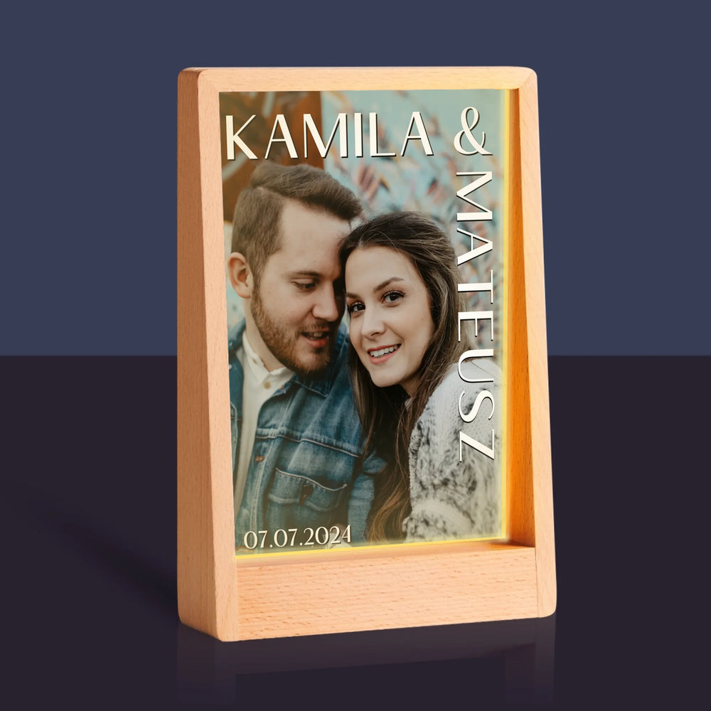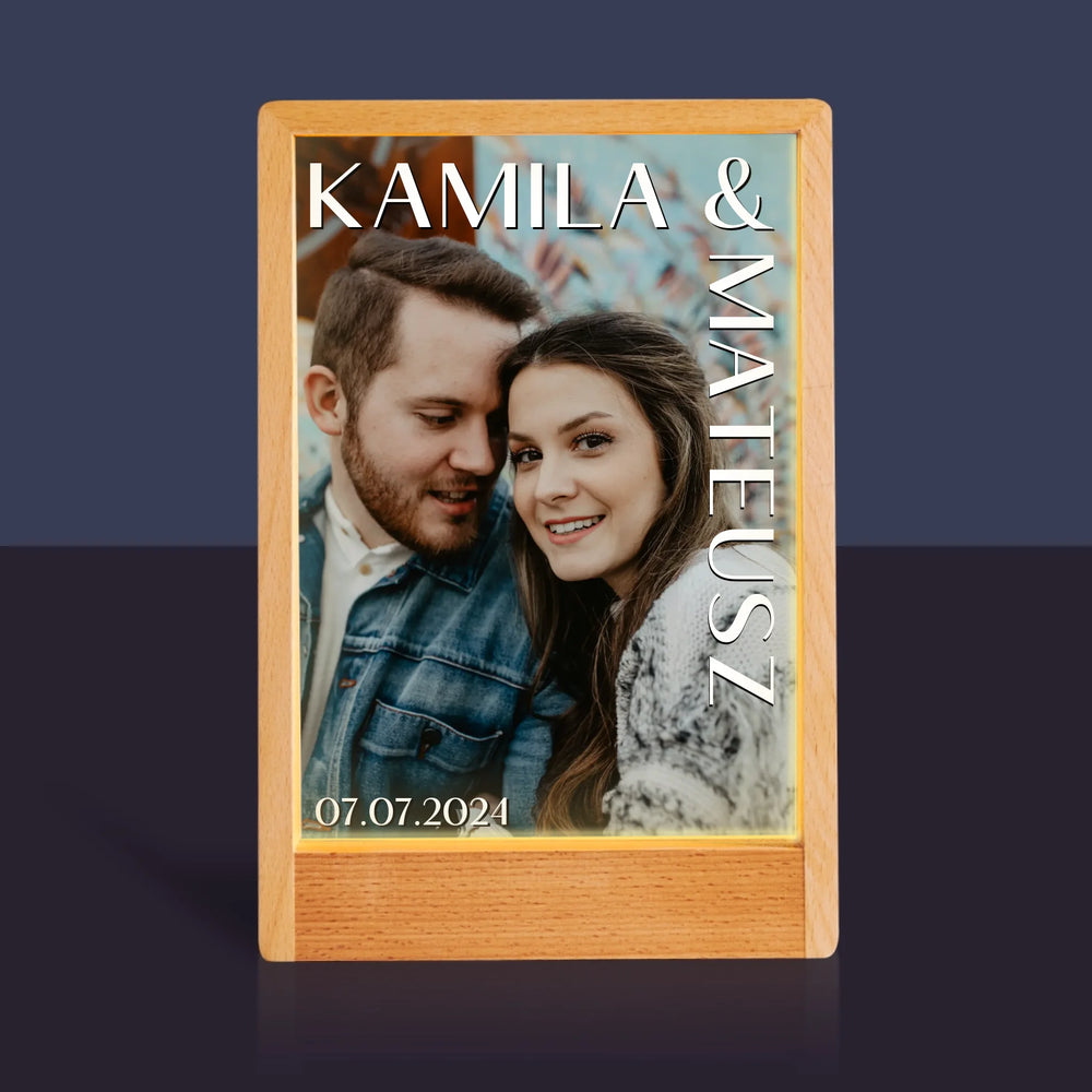 Zdjęcie i Podpis: Imiona Ślub - Wydruk na szkle akrylowym w ramce LED