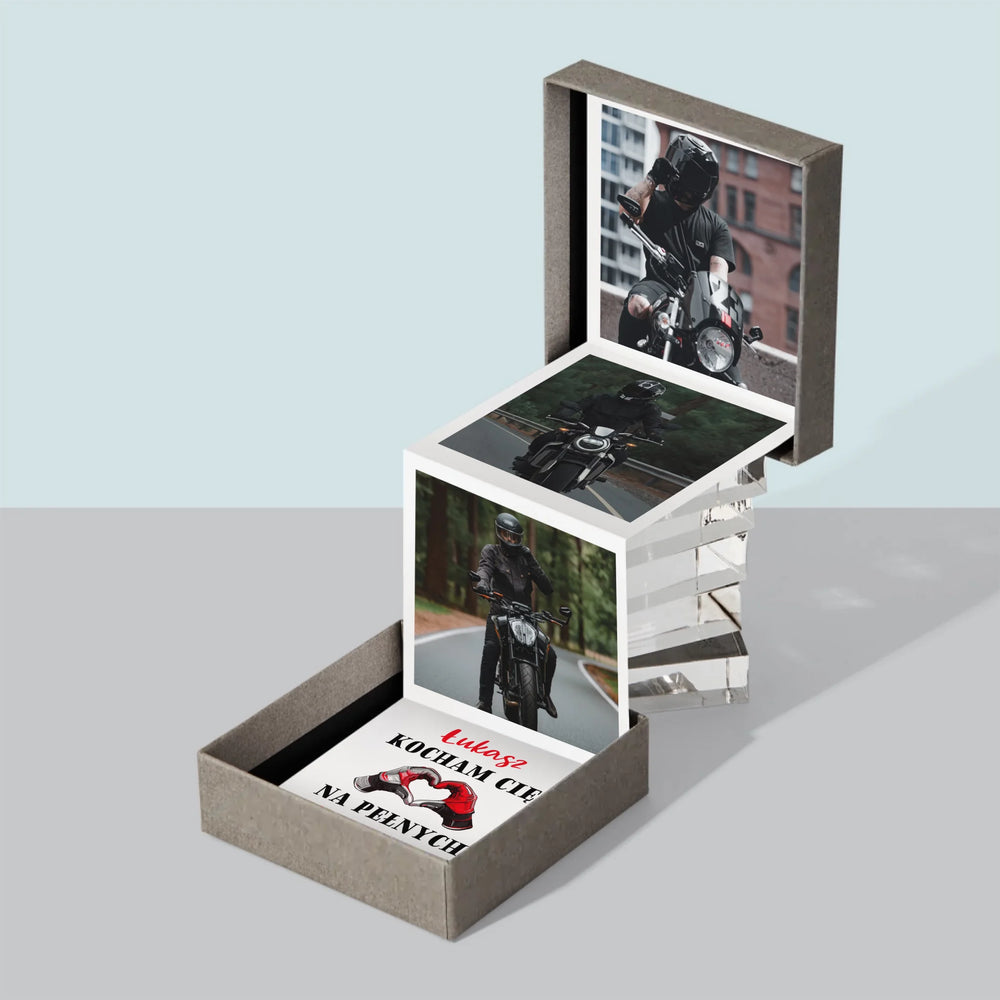 Harmonijka składa się z trzech zdjęć o wymiarach 6,68 x 6,68 cm oraz z personalizowanej karteczki z dedykacją dla obdarowanej osoby