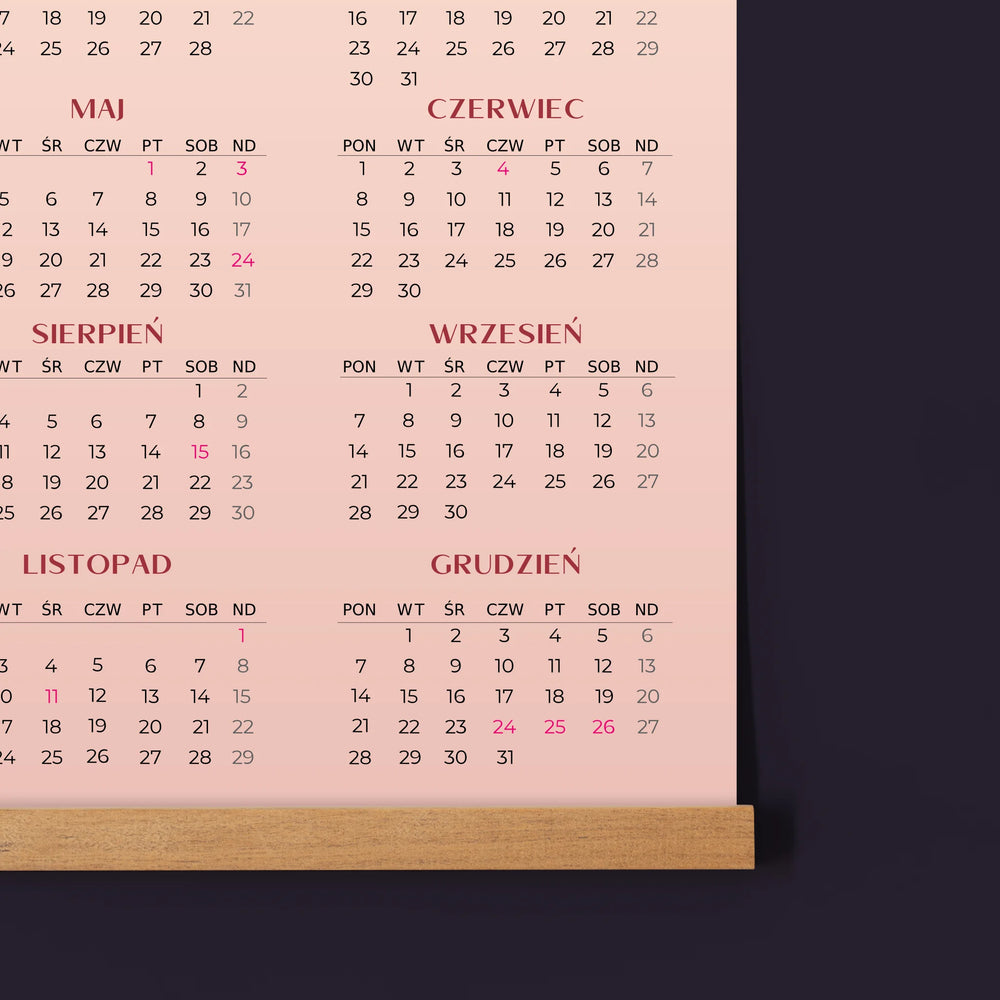 Cały rok umieszczony na jednej stronie, dzięki czemu od razu widoczny jest układ wszystkich miesięcy.
