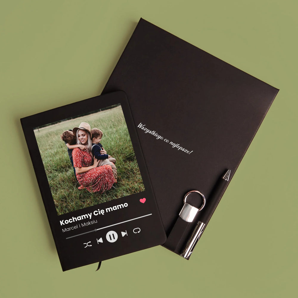• Zestaw z eleganckim notatnikiem z wybraną przez Ciebie personalizacją na okładce.