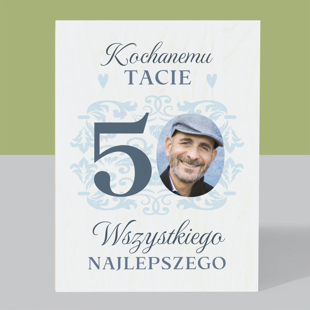 Zdjęcie I Podpis: Kochanemu Tacie Z Okazji 50 Urodzin - Wydruk na drewnie - Pion