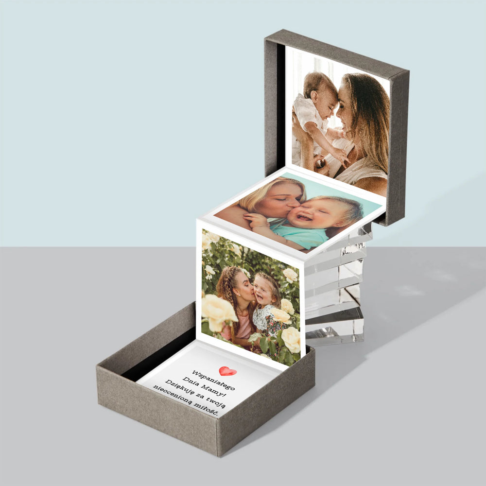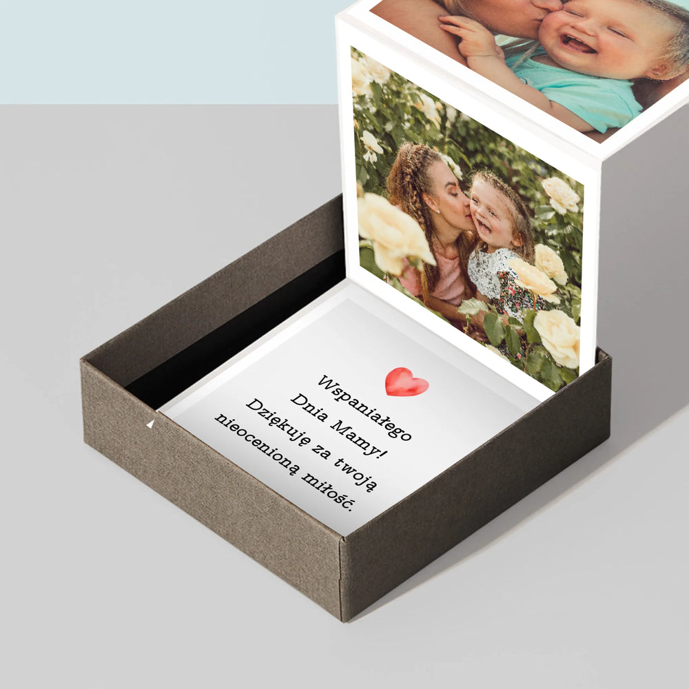 Harmonijka składa się z trzech zdjęć o wymiarach 6,68 x 6,68 cm oraz z personalizowanej karteczki z dedykacją dla obdarowanej osoby