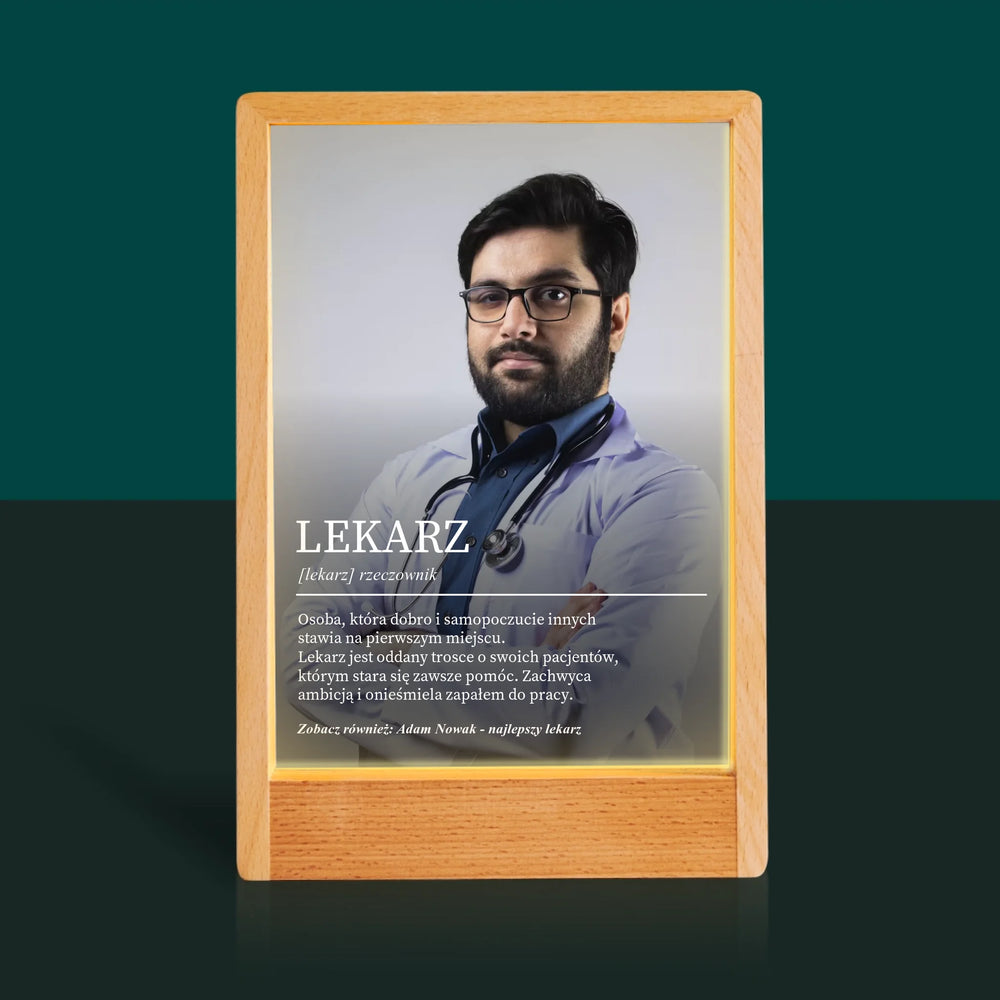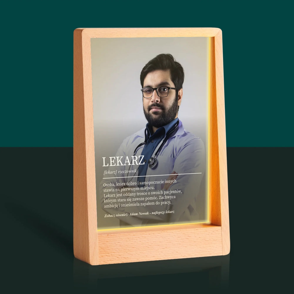 Zdjęcie i Podpis: Lekarz Definicja - Wydruk na szkle akrylowym w ramce LED