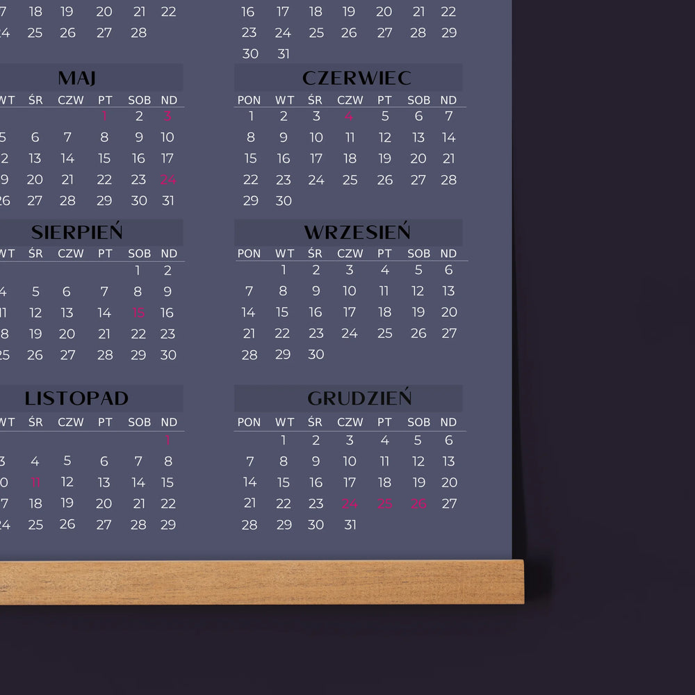 Cały rok umieszczony na jednej stronie, dzięki czemu od razu widoczny jest układ wszystkich miesięcy.