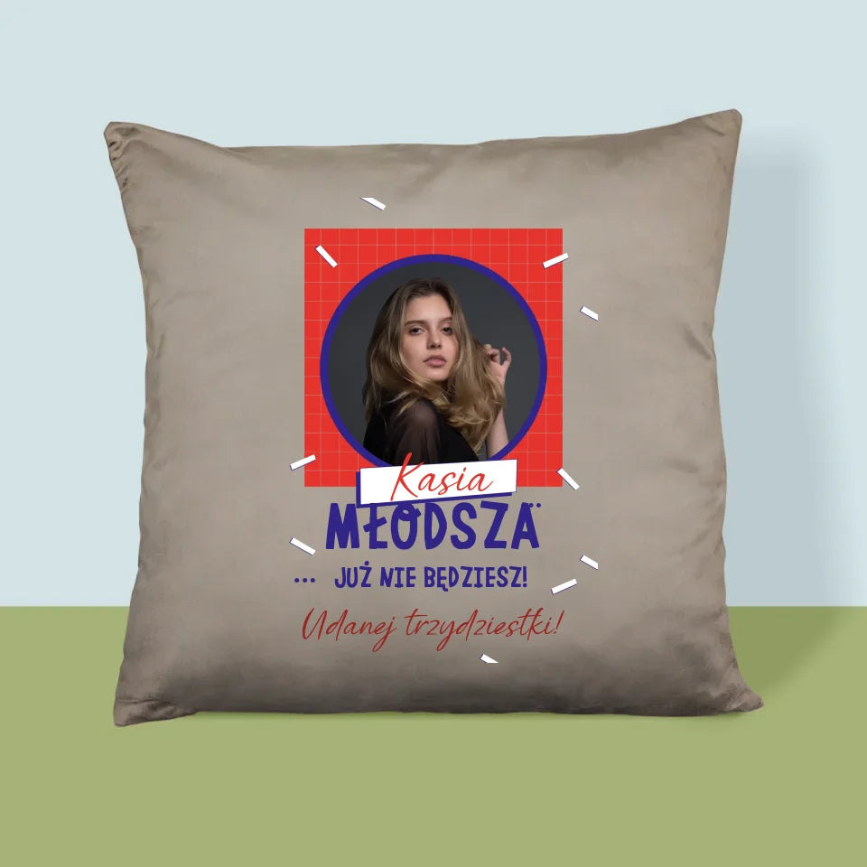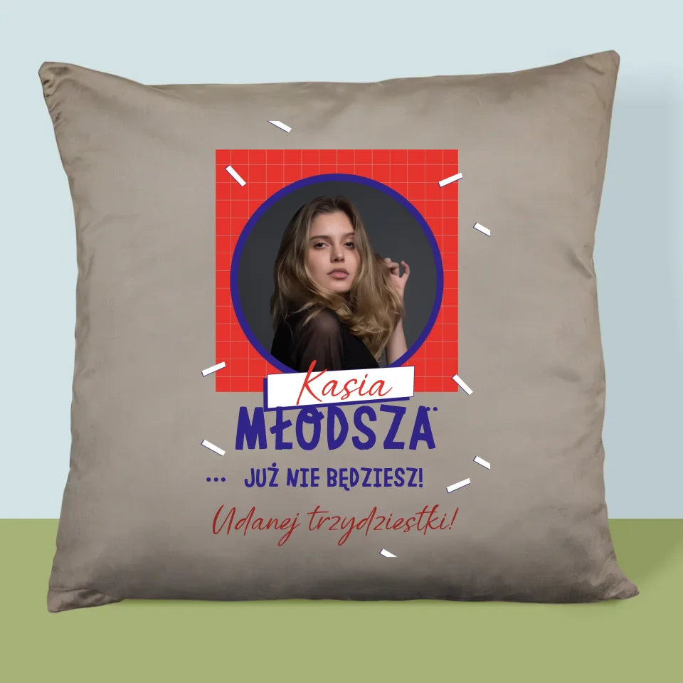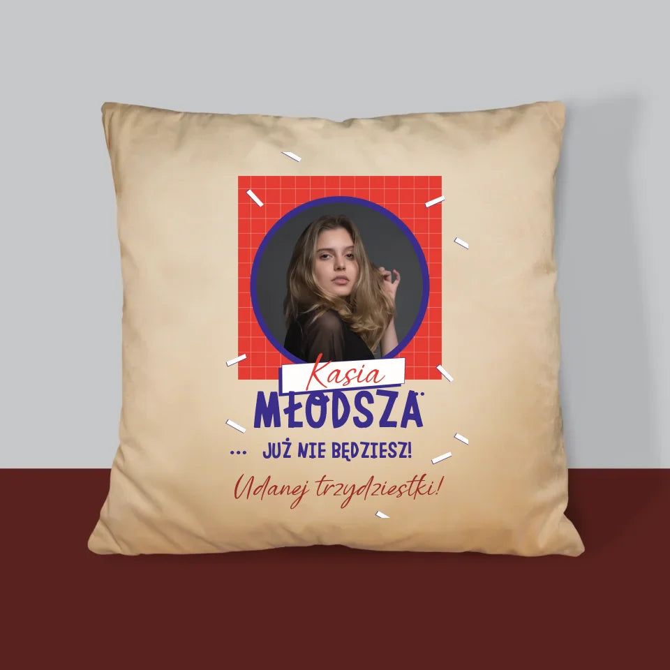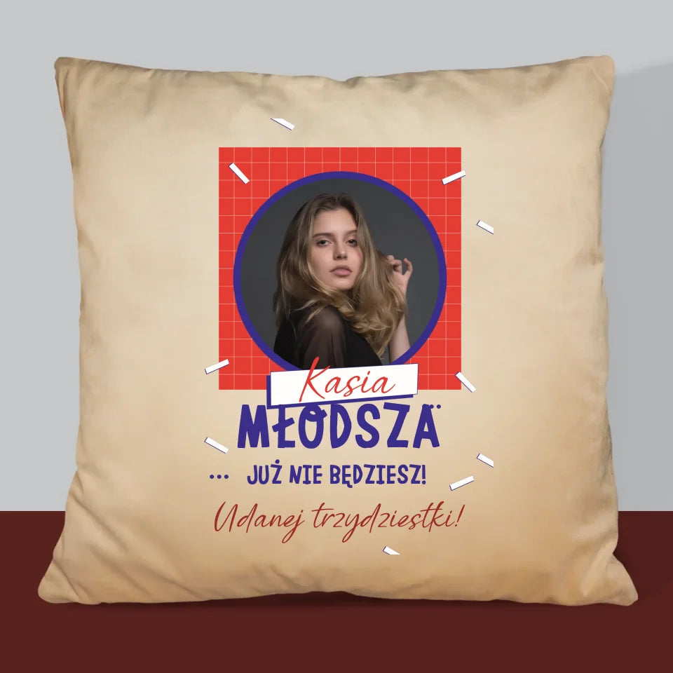Zdjęcie i Podpis: Młodsza Nie Będziesz - Poduszka z Nadrukiem