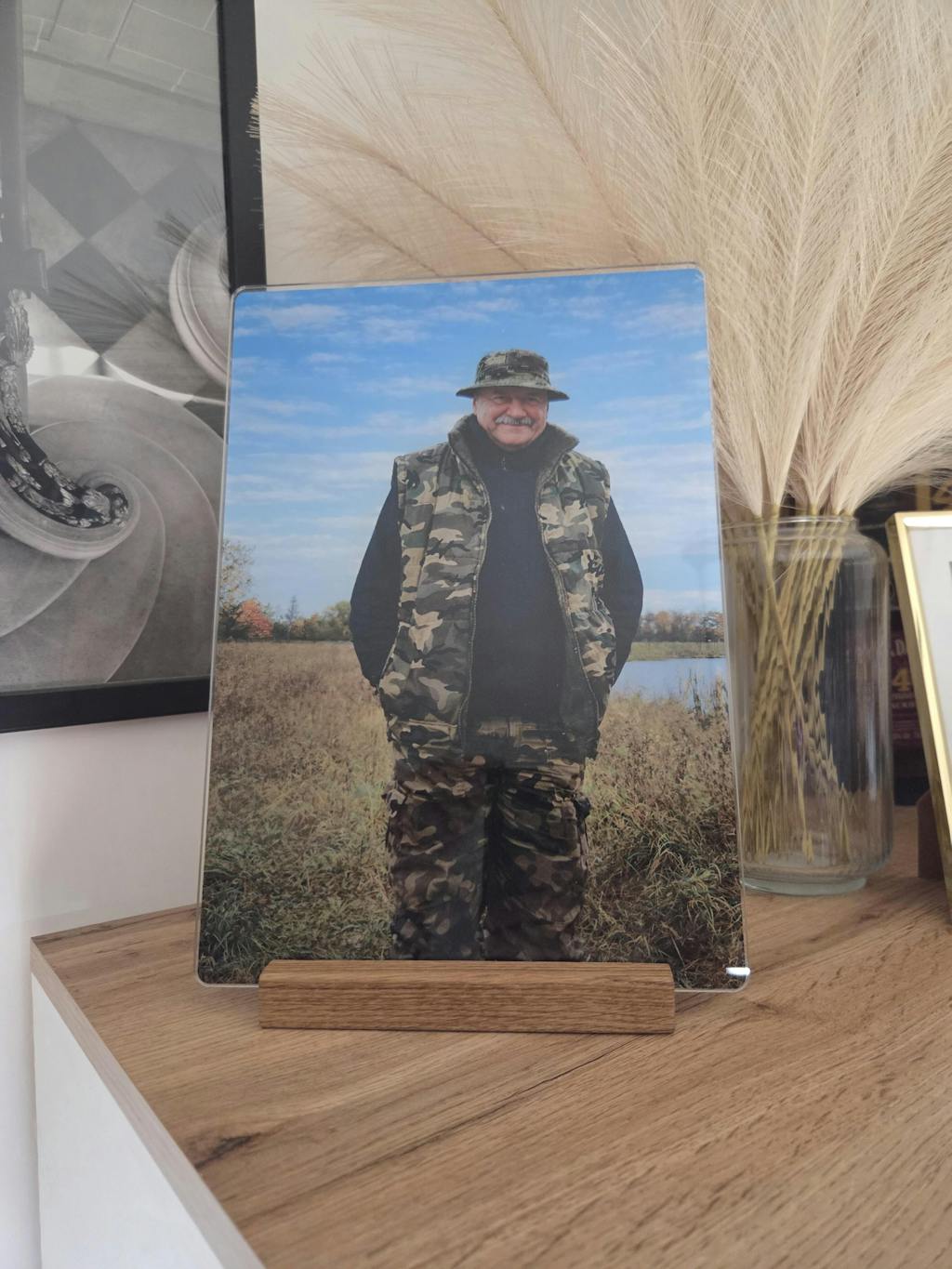 Dzięki eleganckiej, drewnianej podstawce wydruk można postawić w dowolnym miejscu i jest stabilny.