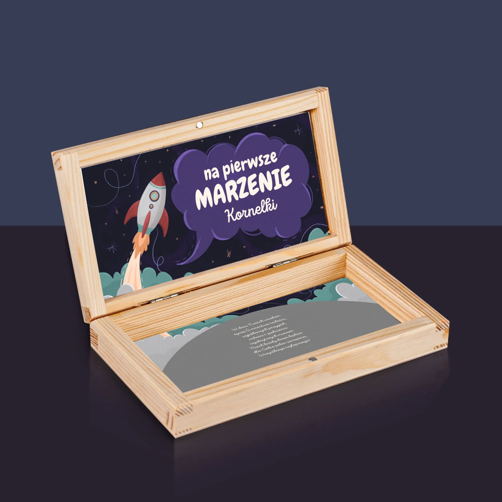 Zdjęcie i Podpis: Na Pierwsze Marzenie - Drewniane pudełko na pieniądze