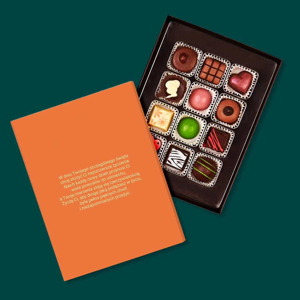 Pyszne praliny z belgijskiej czekolady w eleganckim pudełku z wybraną przez Ciebie personalizacją.
