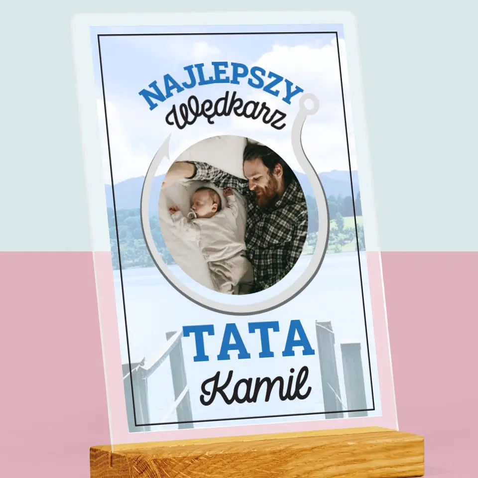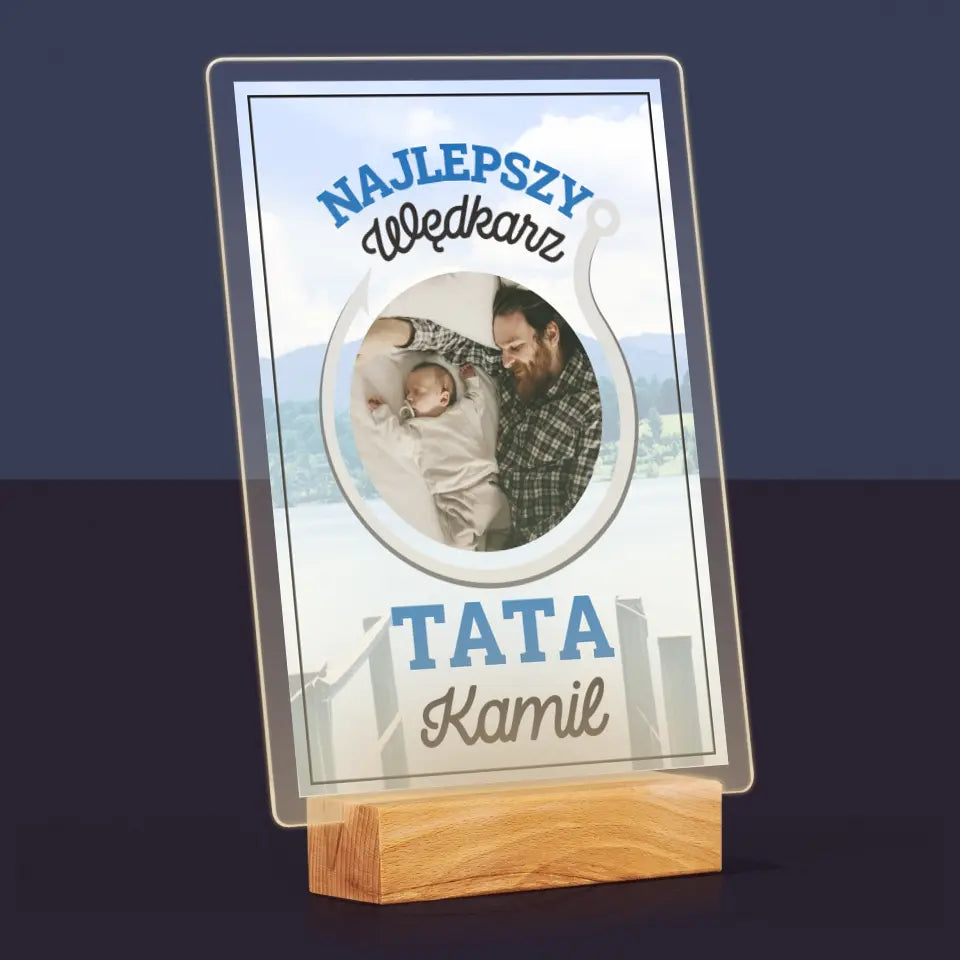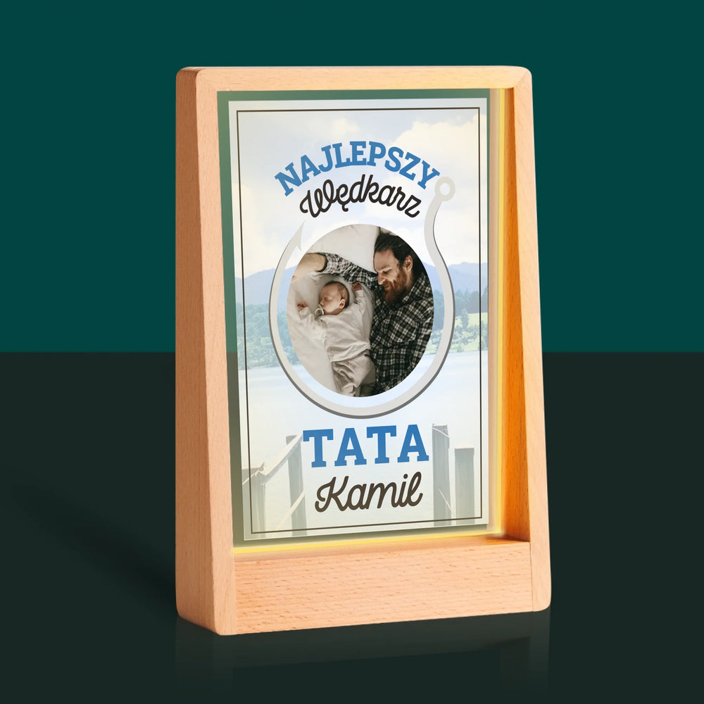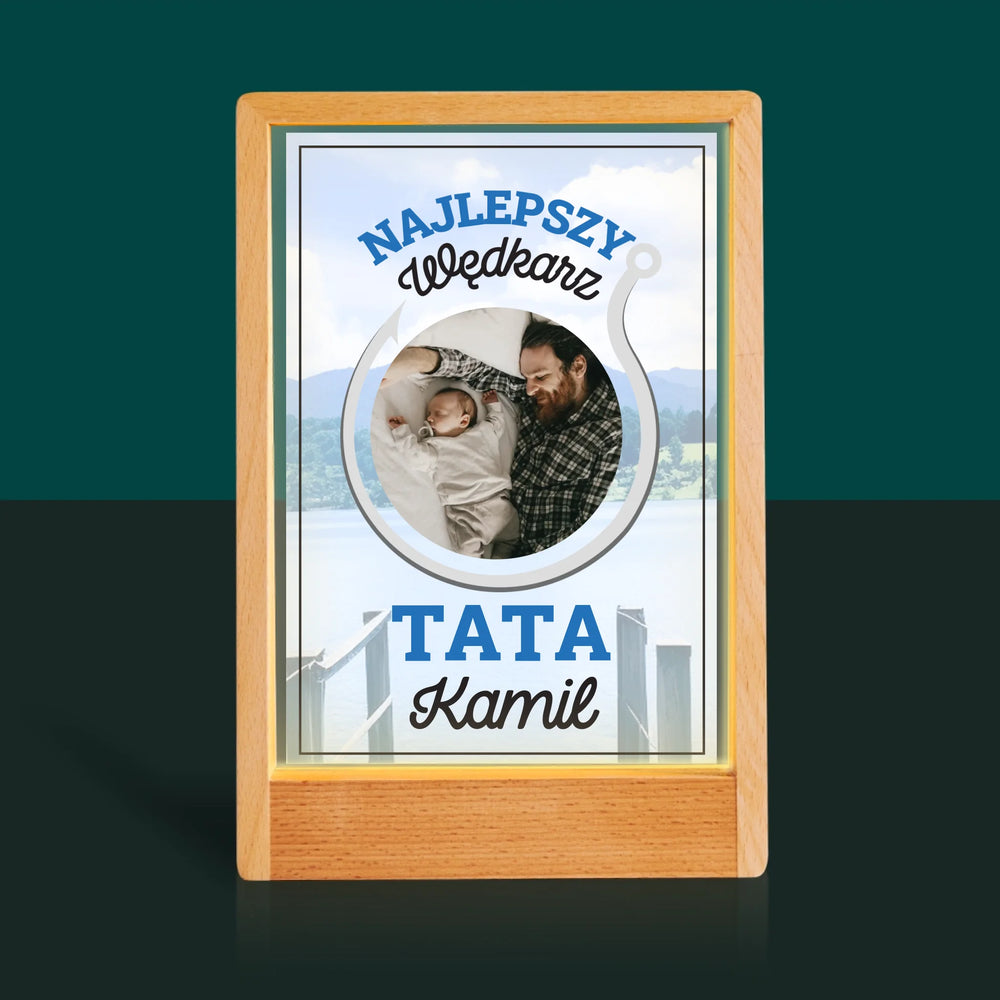 Zdjęcie i Podpis: Najlepszy Wędkarz Tata - Wydruk na szkle akrylowym w ramce LED