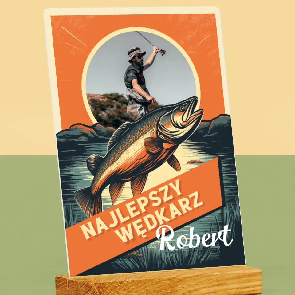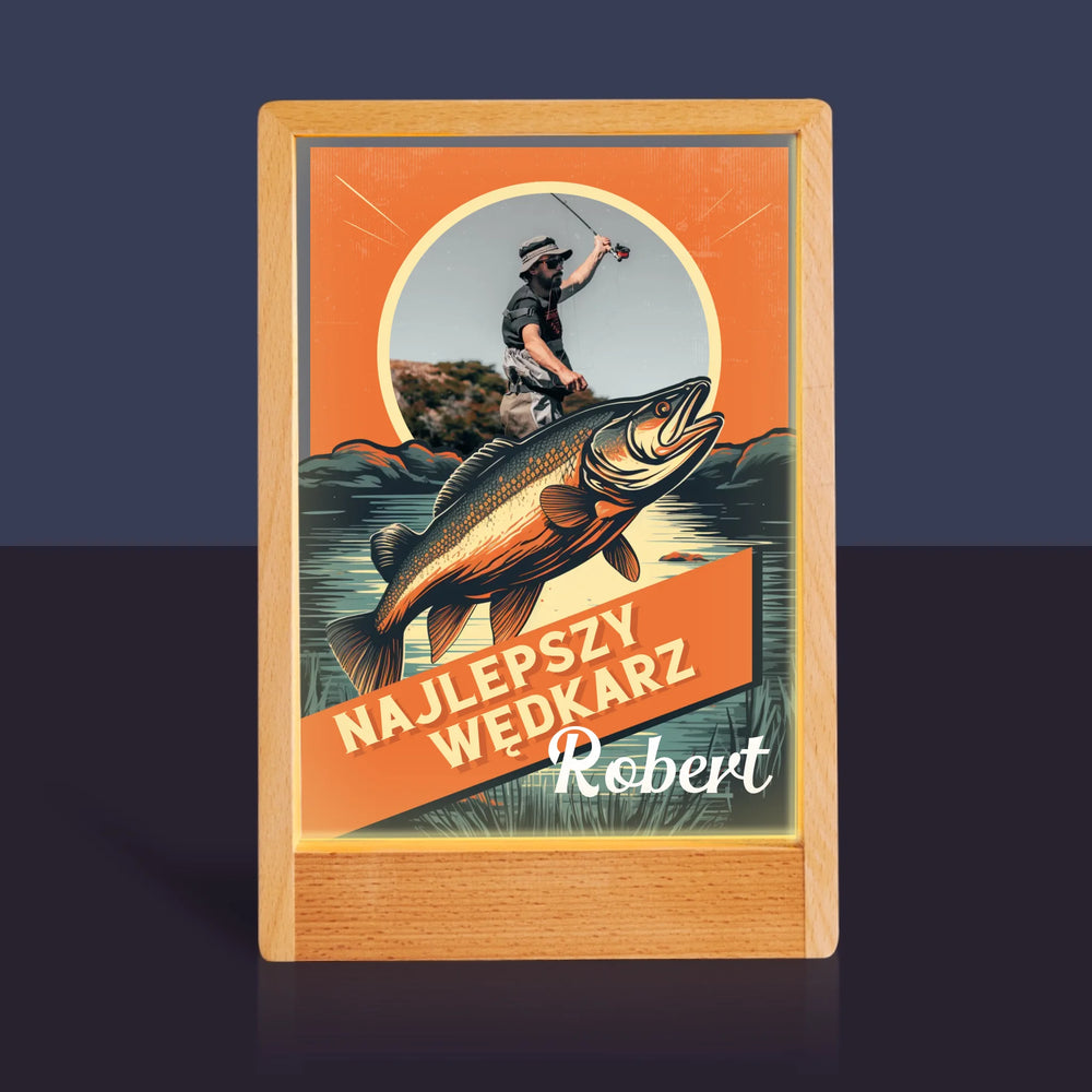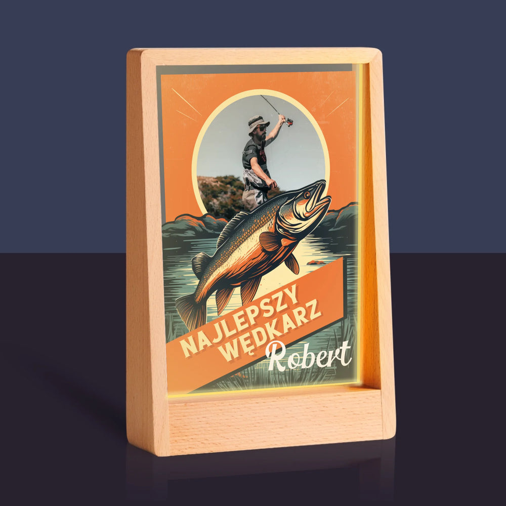 Zdjęcie i Podpis: Najlepszy Wędkarz - Wydruk na szkle akrylowym w ramce LED