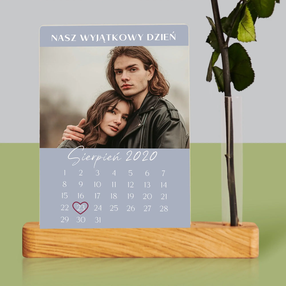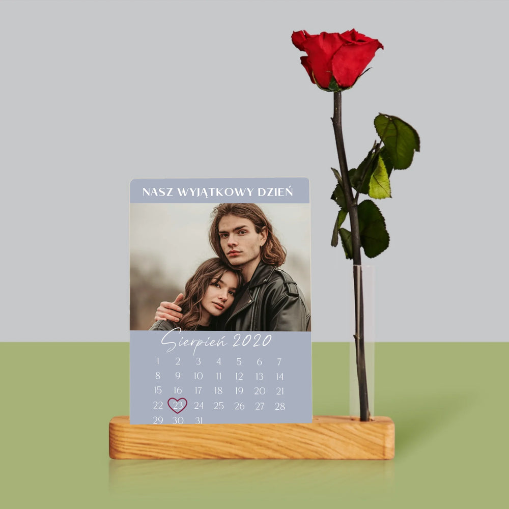 Dołączona róża w małym wazonie w kształcie probówki, umieszczonym w podstawce razem z wydrukiem na szkle akrylowym.