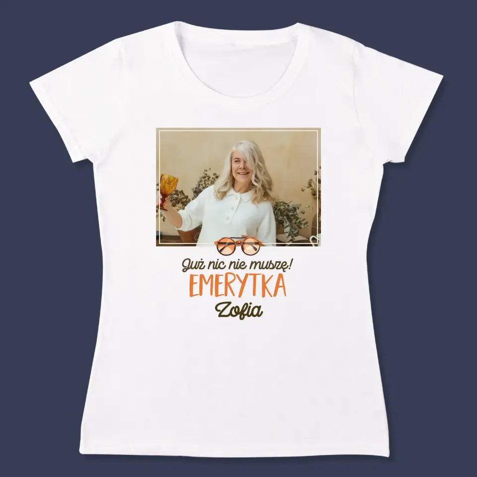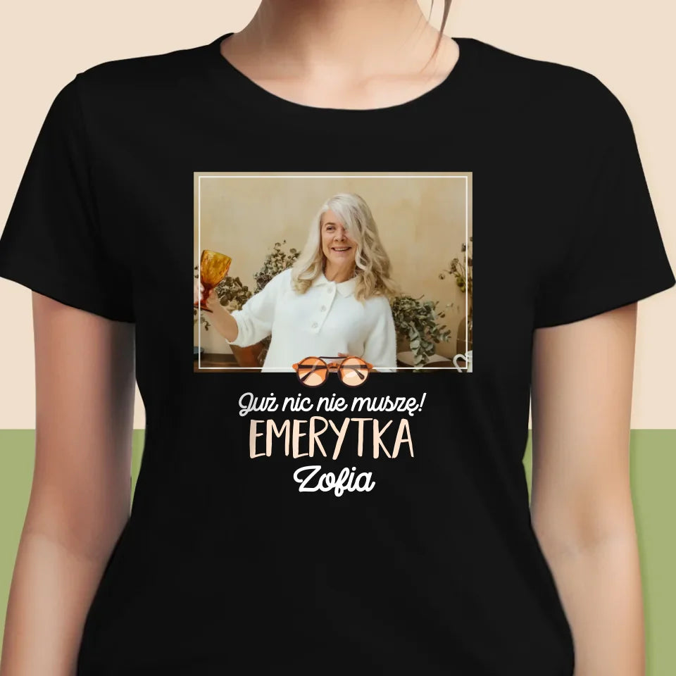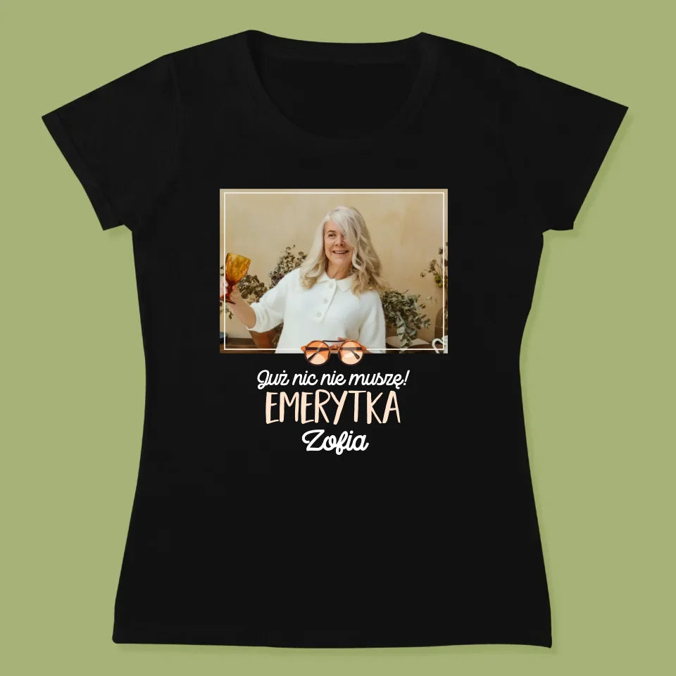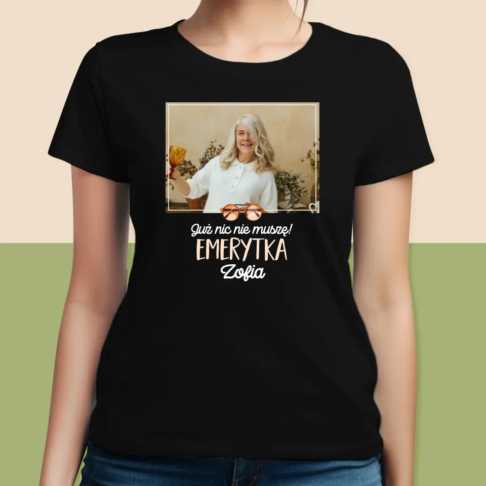 Zdjęcie i Podpis: Nic Nie Muszę! Emerytka - Personalizowana Koszulka Damska
