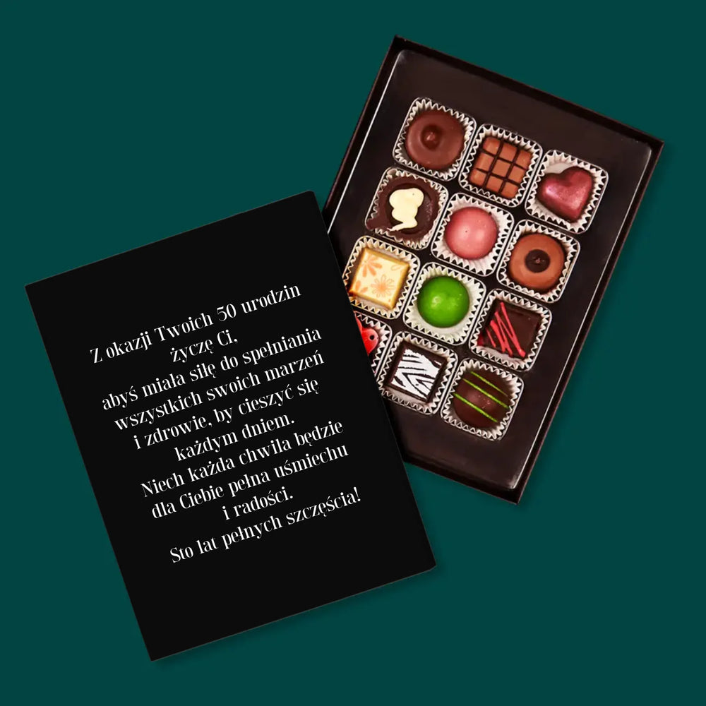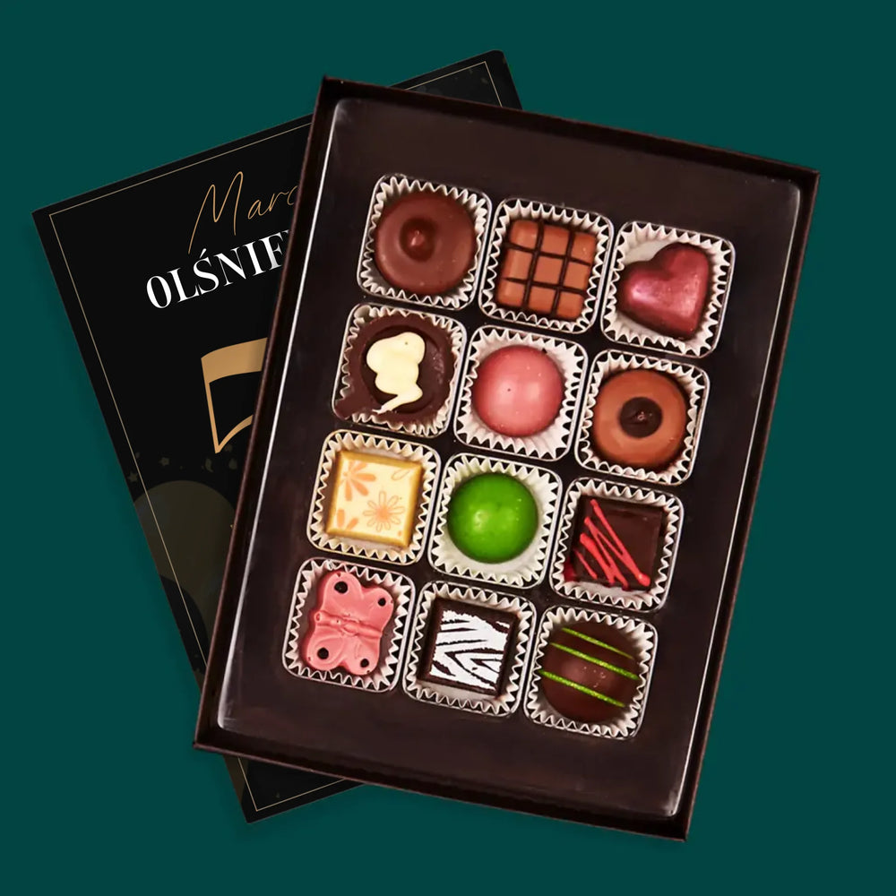 Pyszne praliny z belgijskiej czekolady w eleganckim pudełku z wybraną przez Ciebie personalizacją.