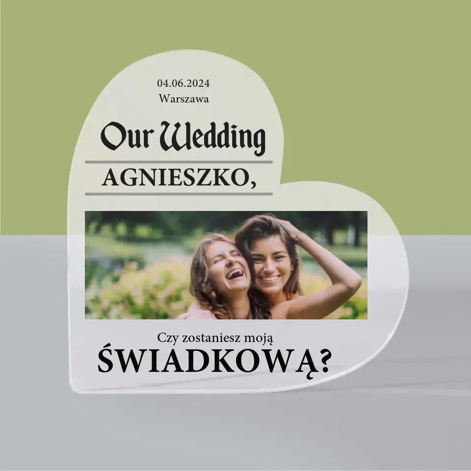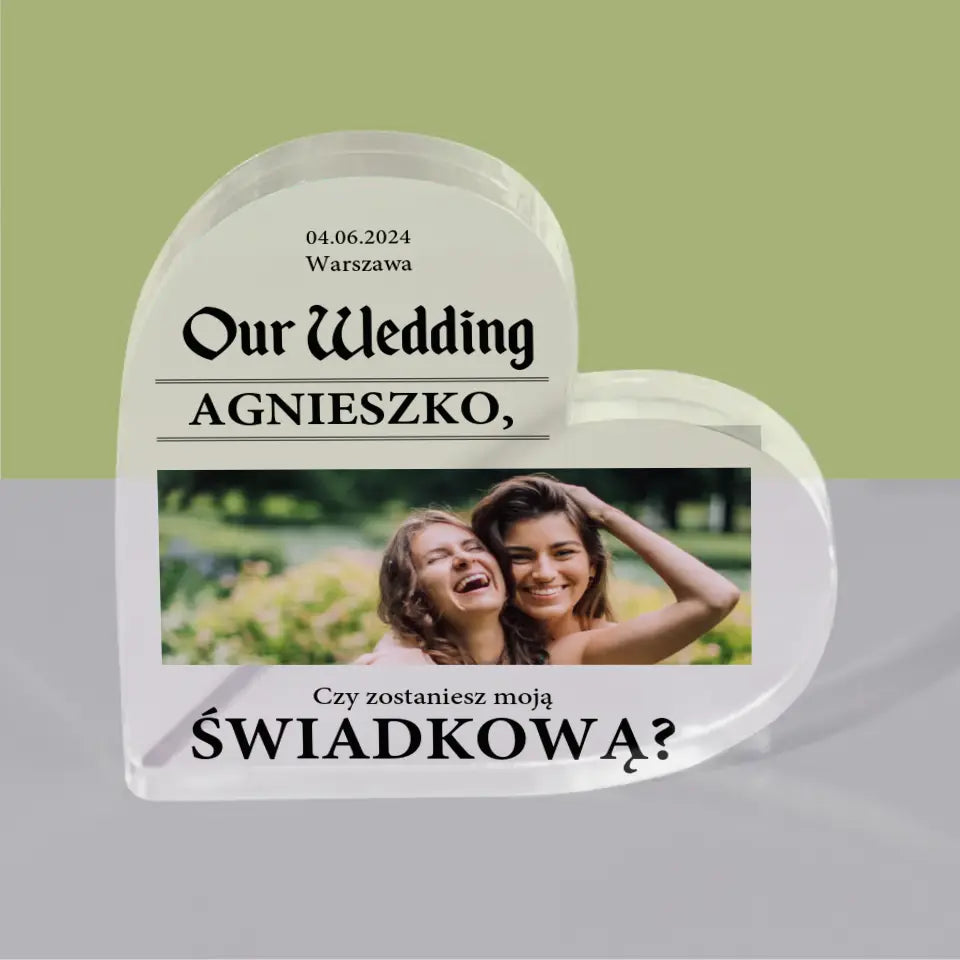 Zdjęcie i Podpis: Our Wedding Świadkowa - Blok Akrylowy Serce