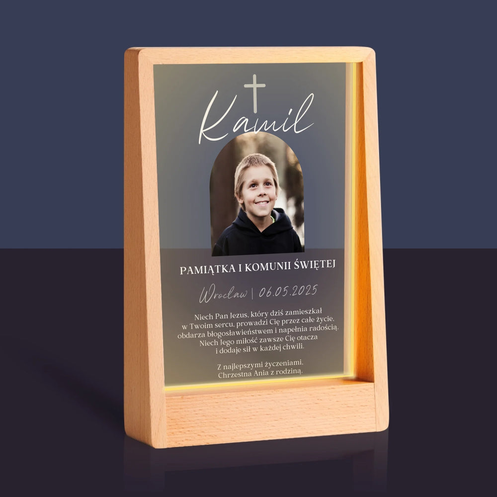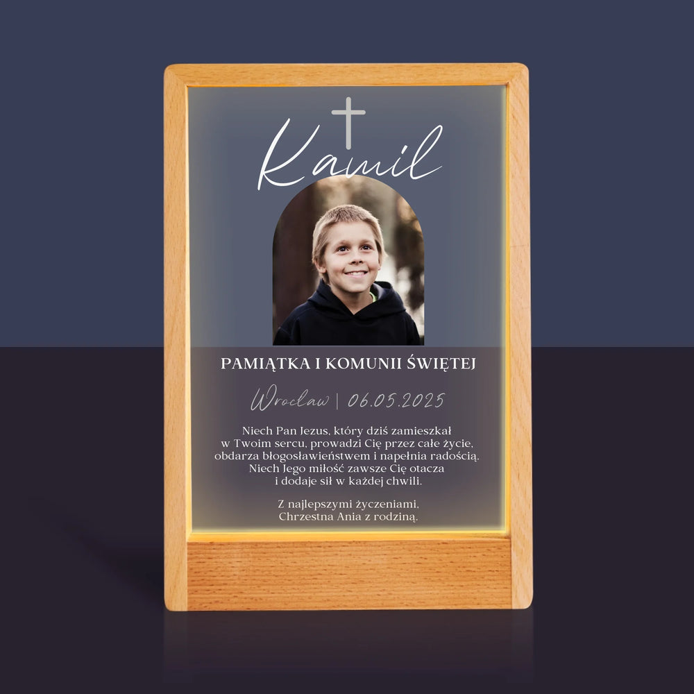 Zdjęcie i Podpis: Pamiątka Komunii Klasyczna - Wydruk na szkle akrylowym w ramce LED