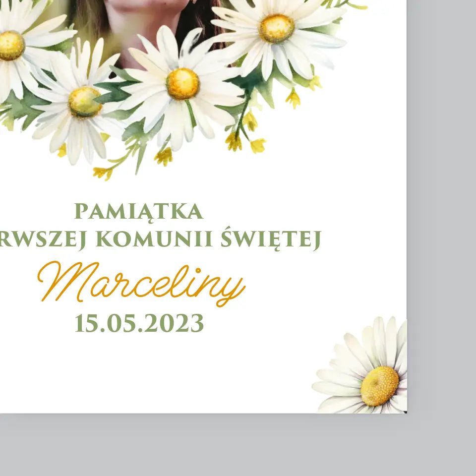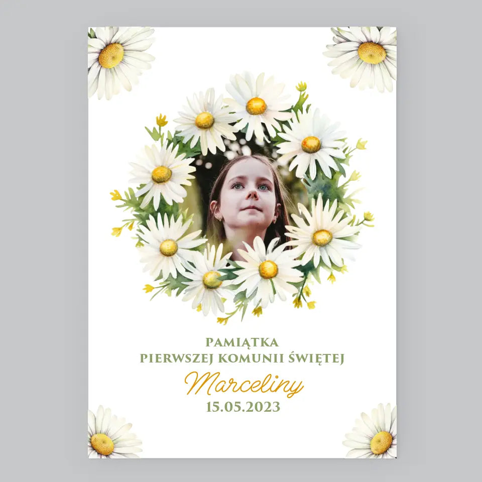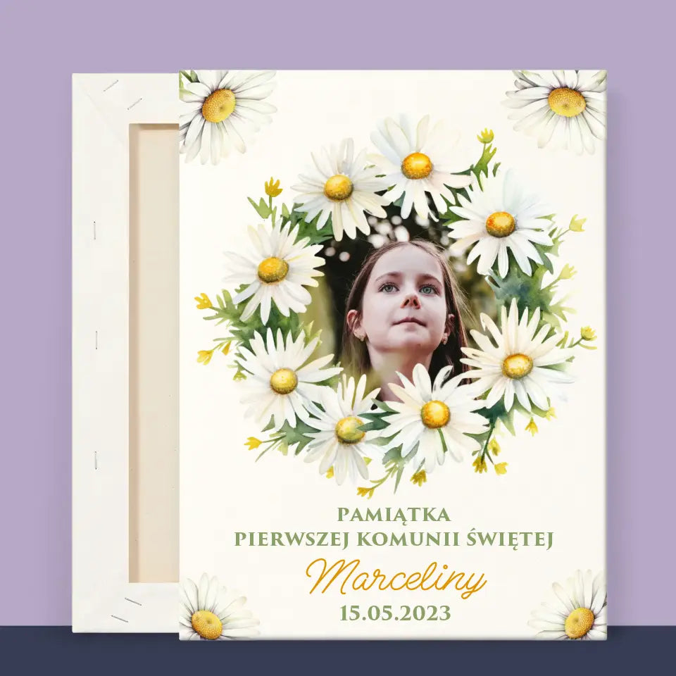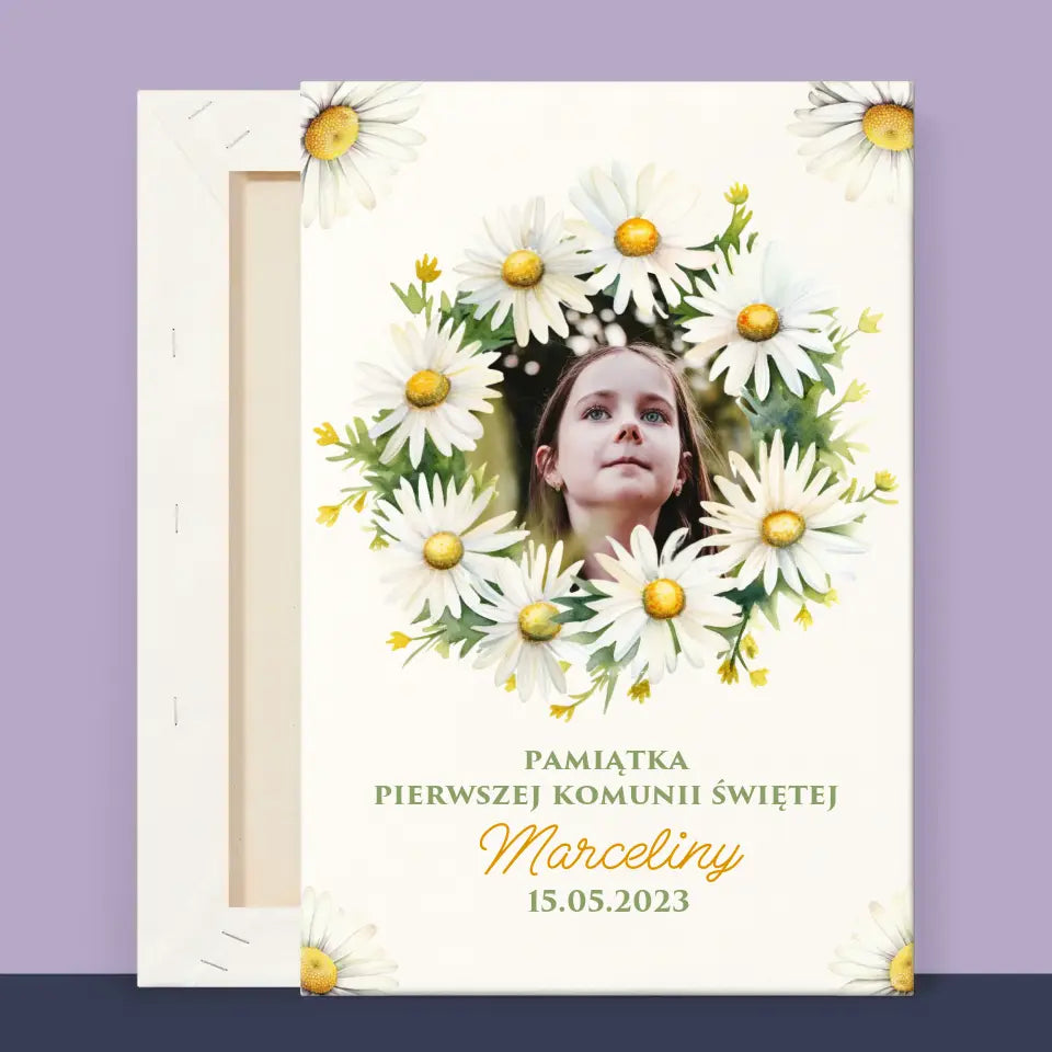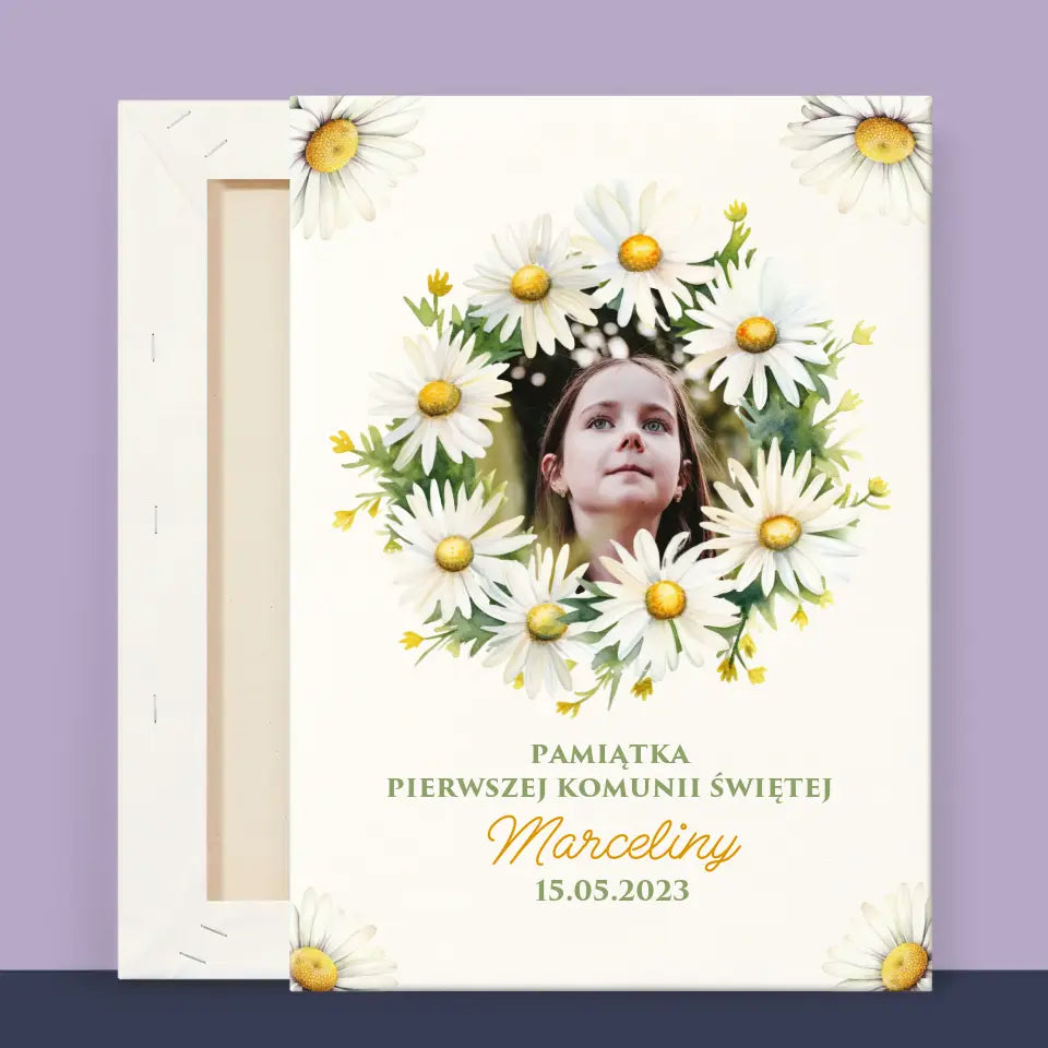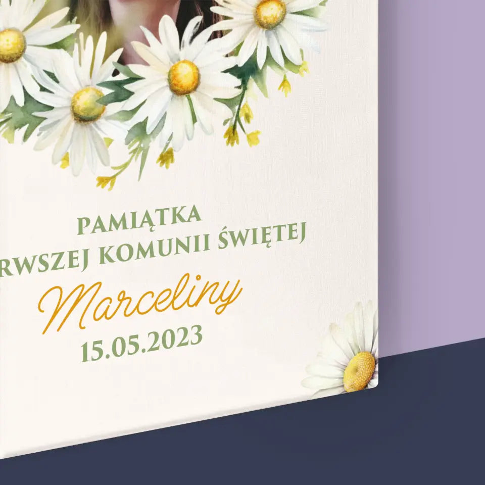 Zdjęcie i Podpis: Pamiątka Komunii Świętej Stokrotki - Personalizowany Obraz na płótnie