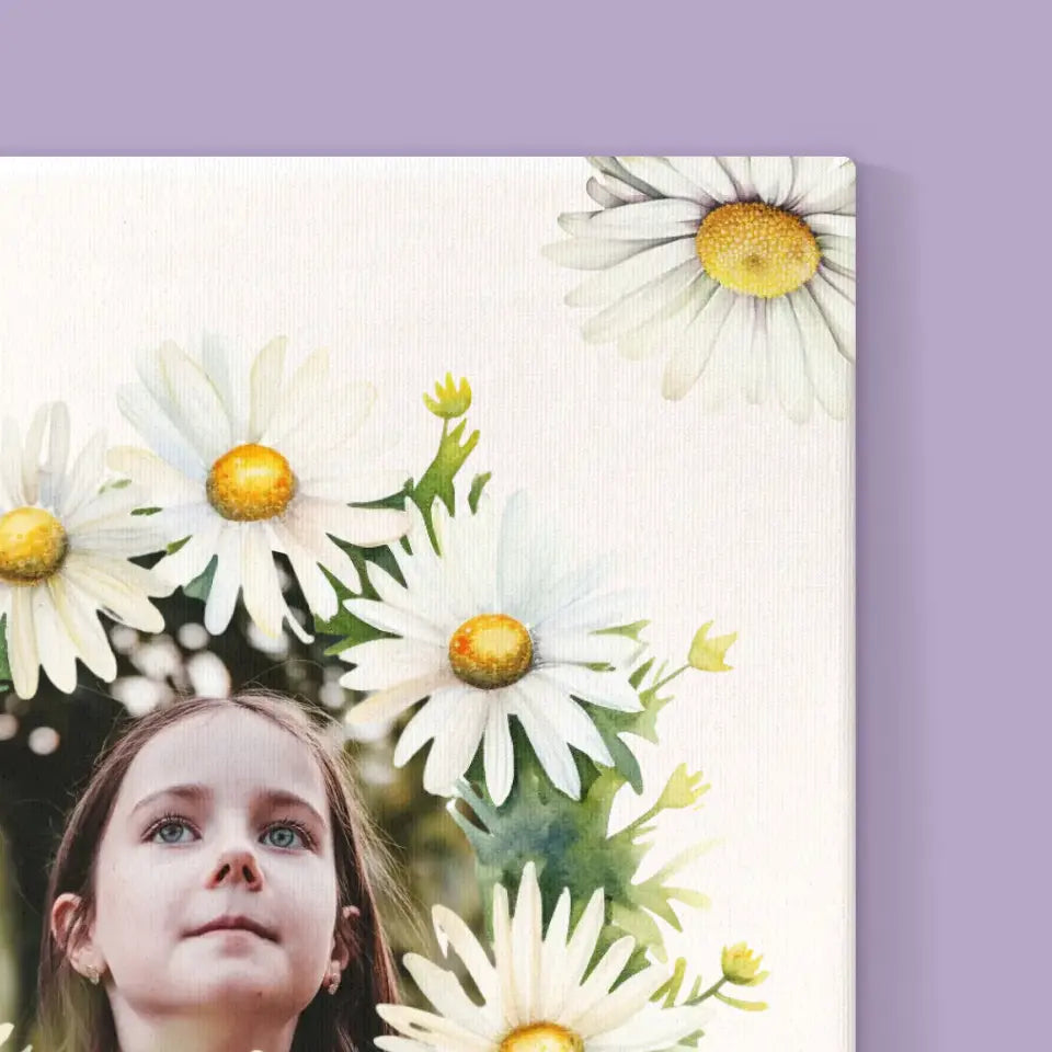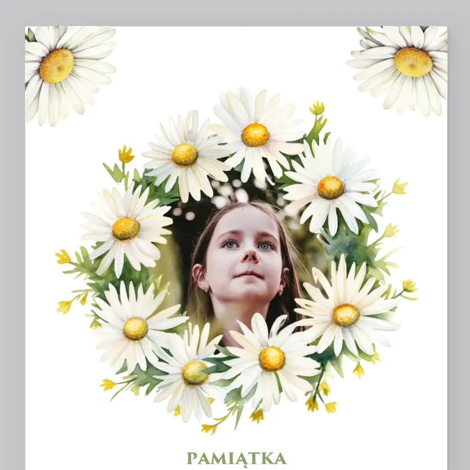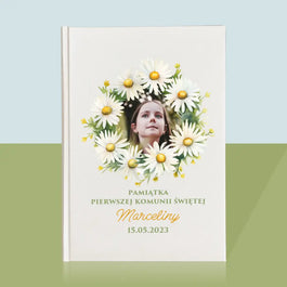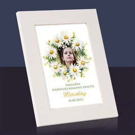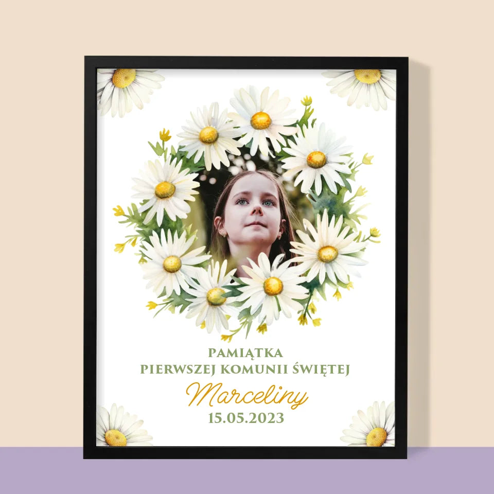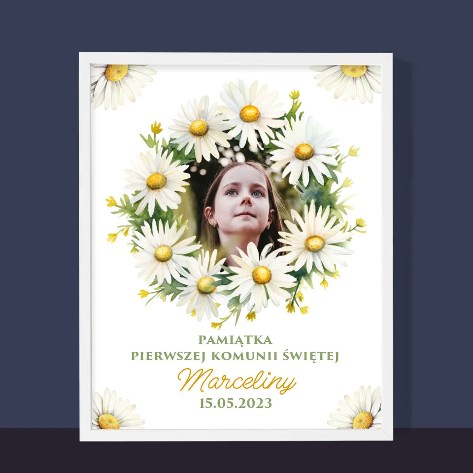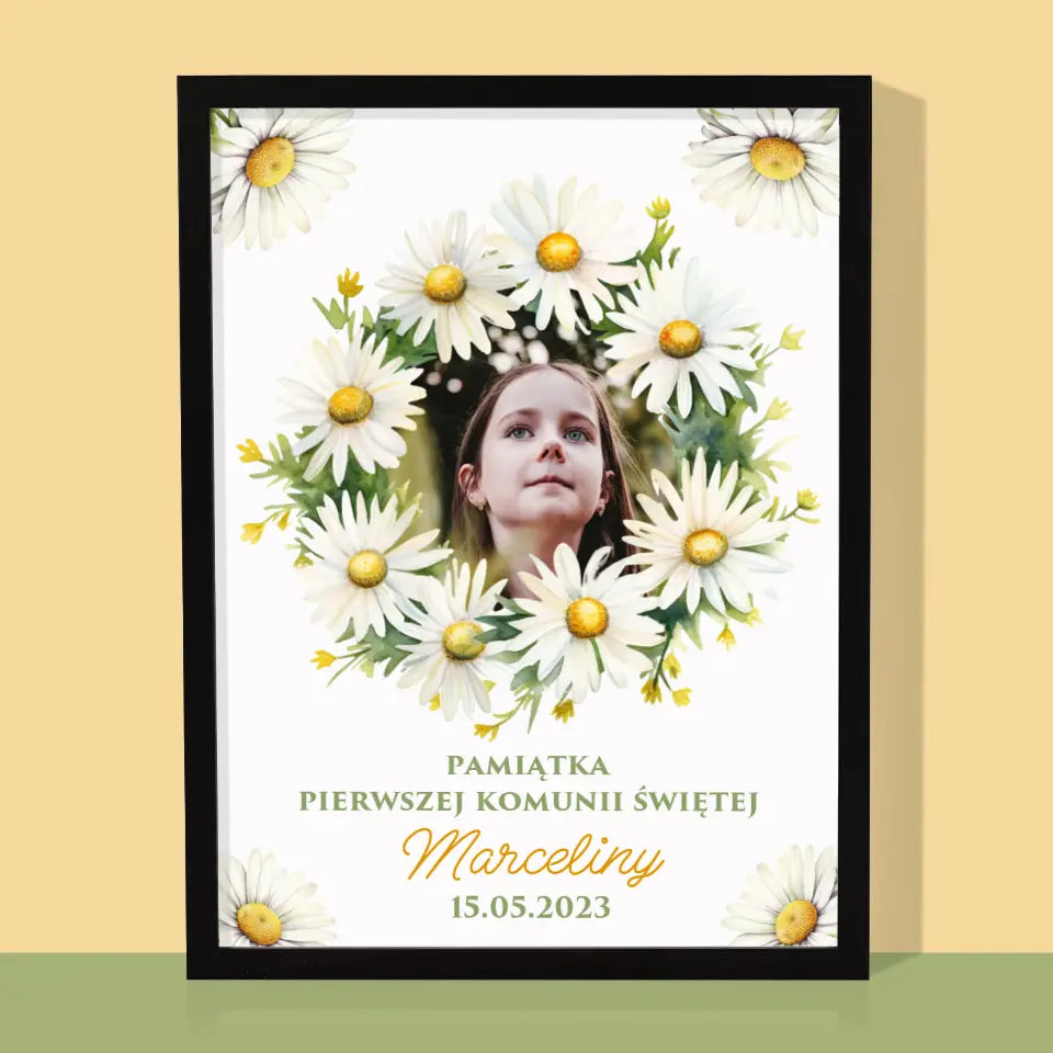 Zdjęcie i Podpis: Pamiątka Komunii Świętej Stokrotki - Personalizowany Obraz na płótnie