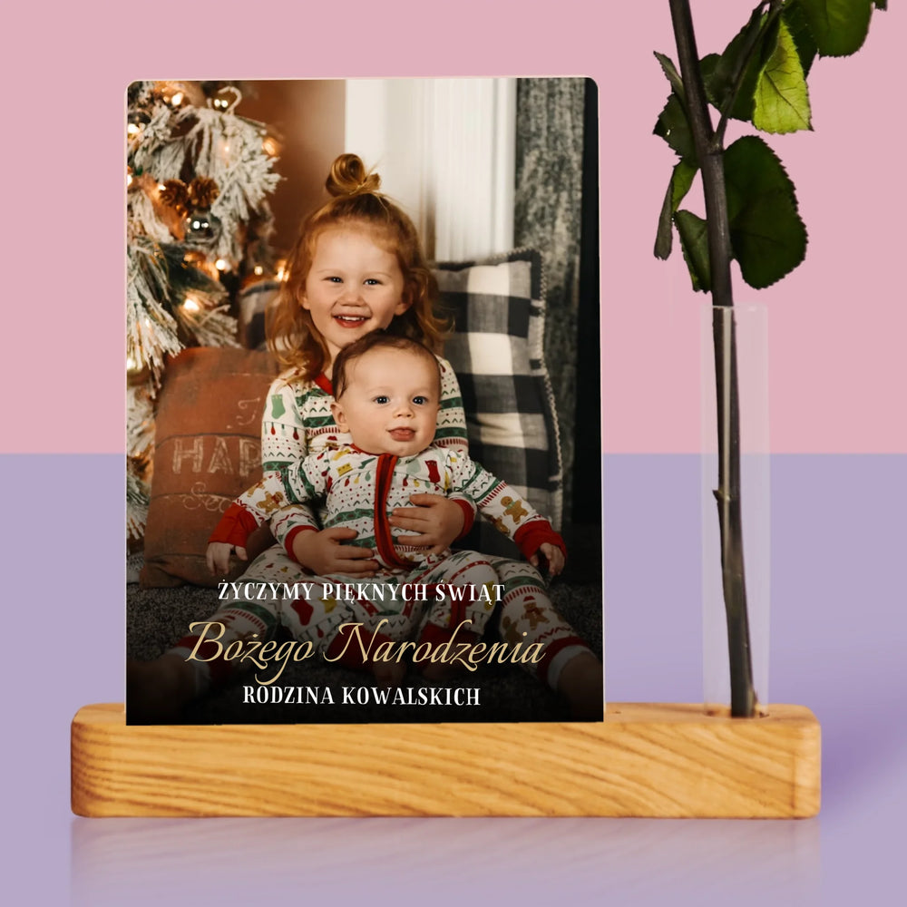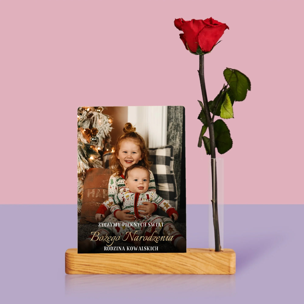 Dołączona róża w małym wazonie w kształcie probówki, umieszczonym w podstawce razem z wydrukiem na szkle akrylowym.