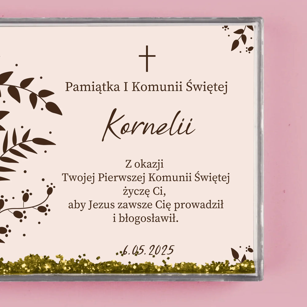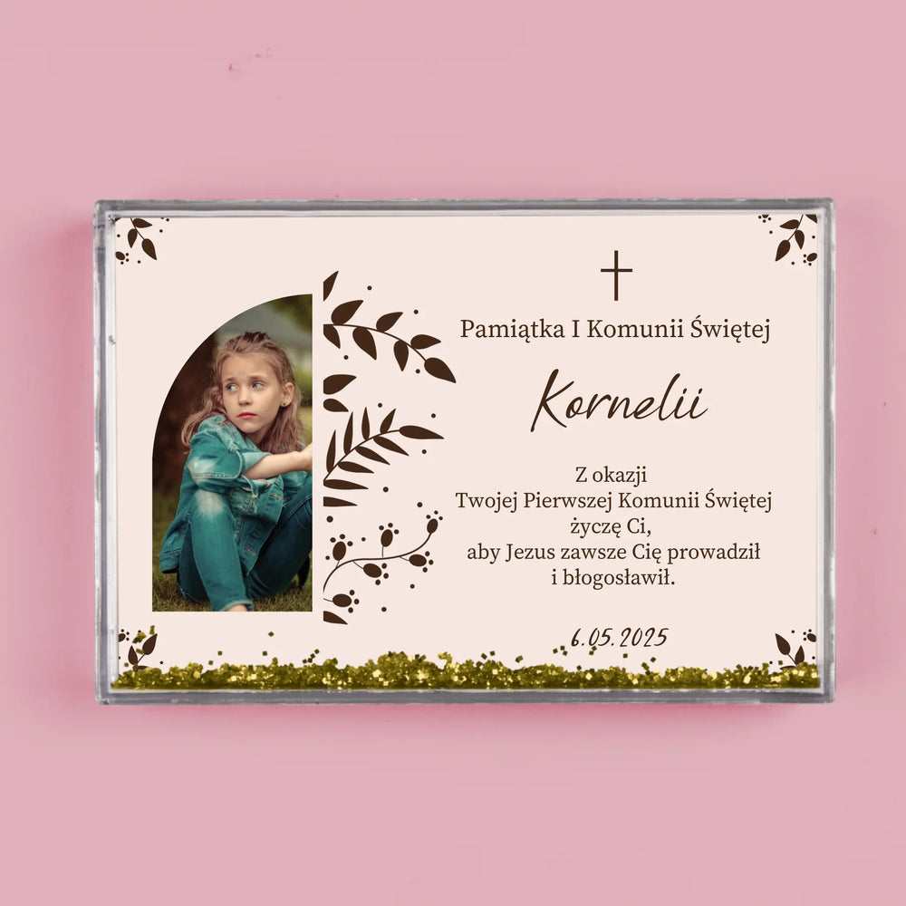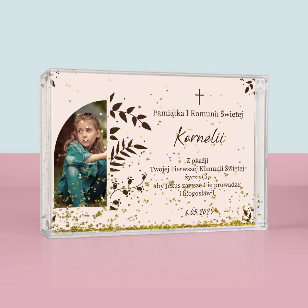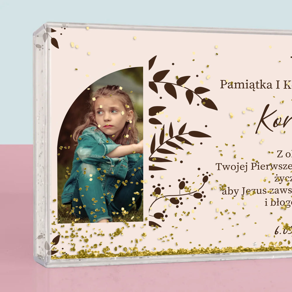 Zdjęcie i Podpis: Pierwsza Komunia Święta Listki - Personalizowana Ramka Wodna