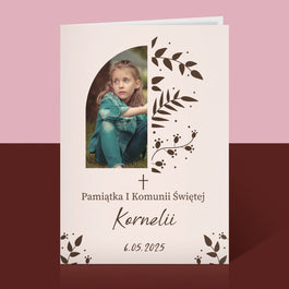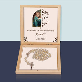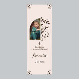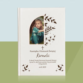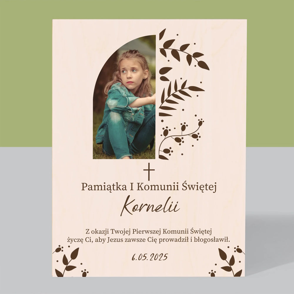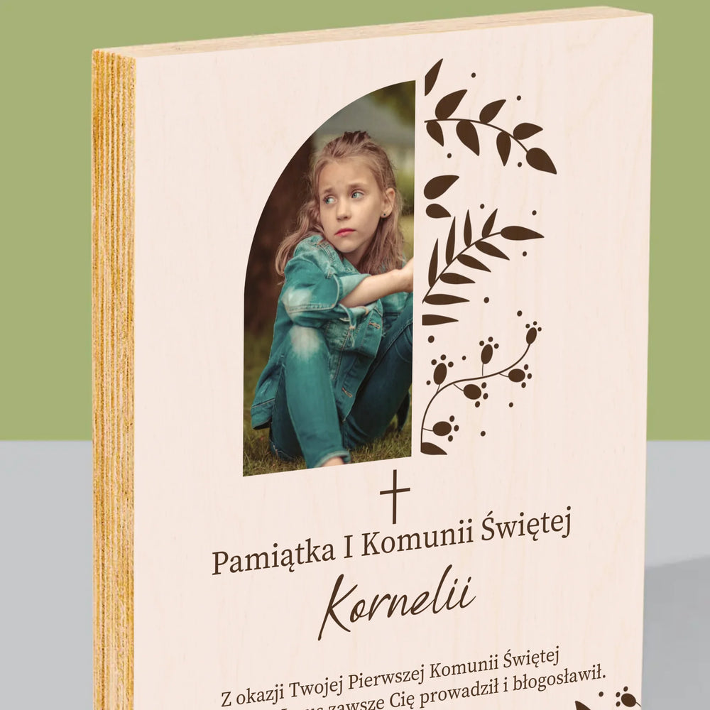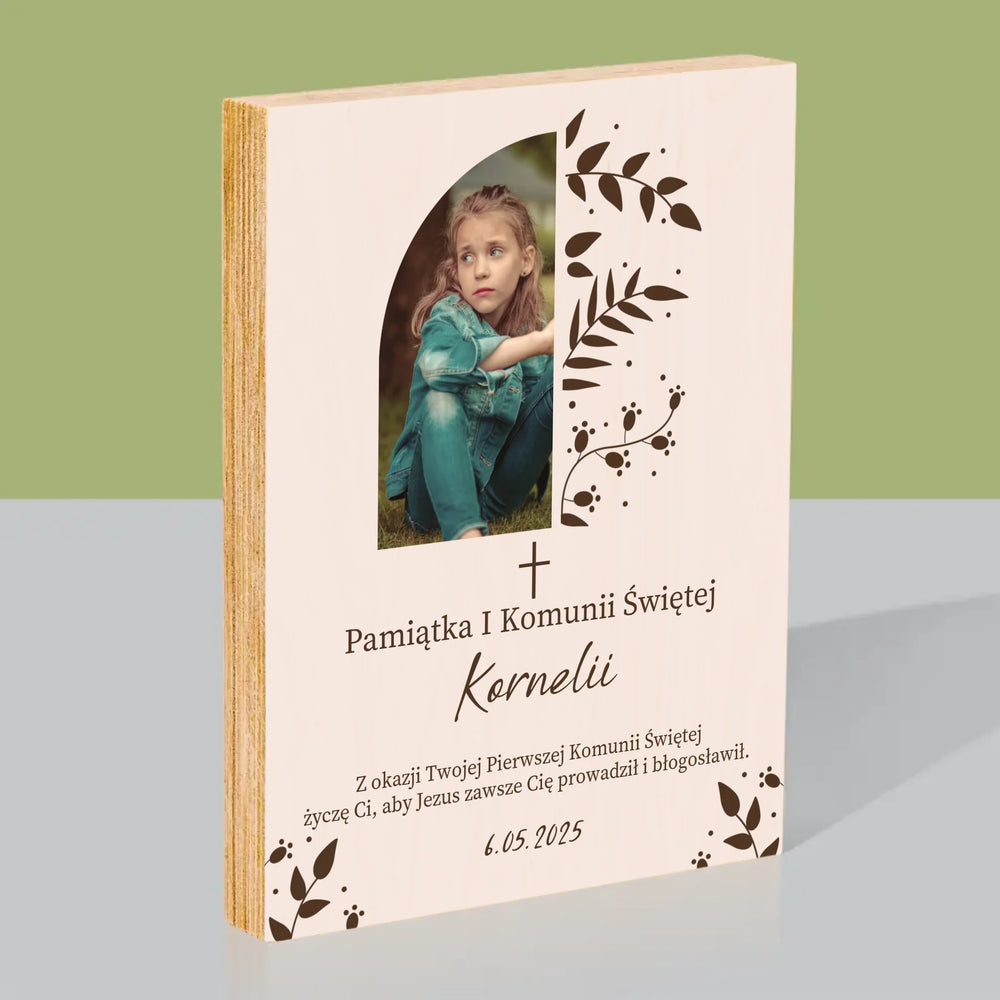 Zdjęcie i Podpis: Pierwsza Komunia Święta Listki - Wydruk na drewnie - Pion