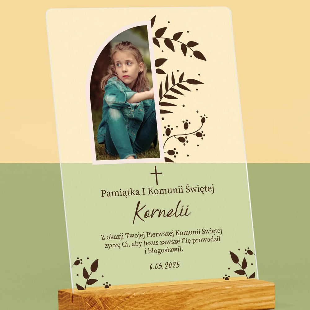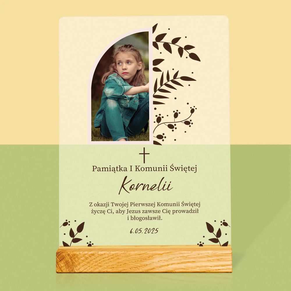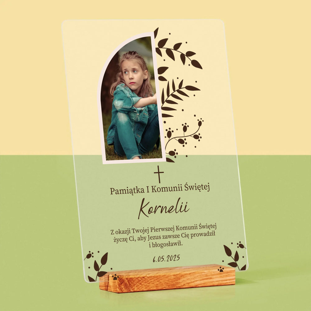 Zdjęcie i Podpis: Pierwsza Komunia Święta Listki - Wydruk na szkle akrylowym