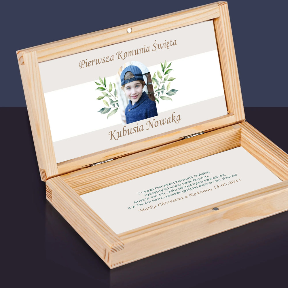 Zdjęcie i Podpis: Pierwsza Komunia Święta Życzenia - Drewniane pudełko na pieniądze
