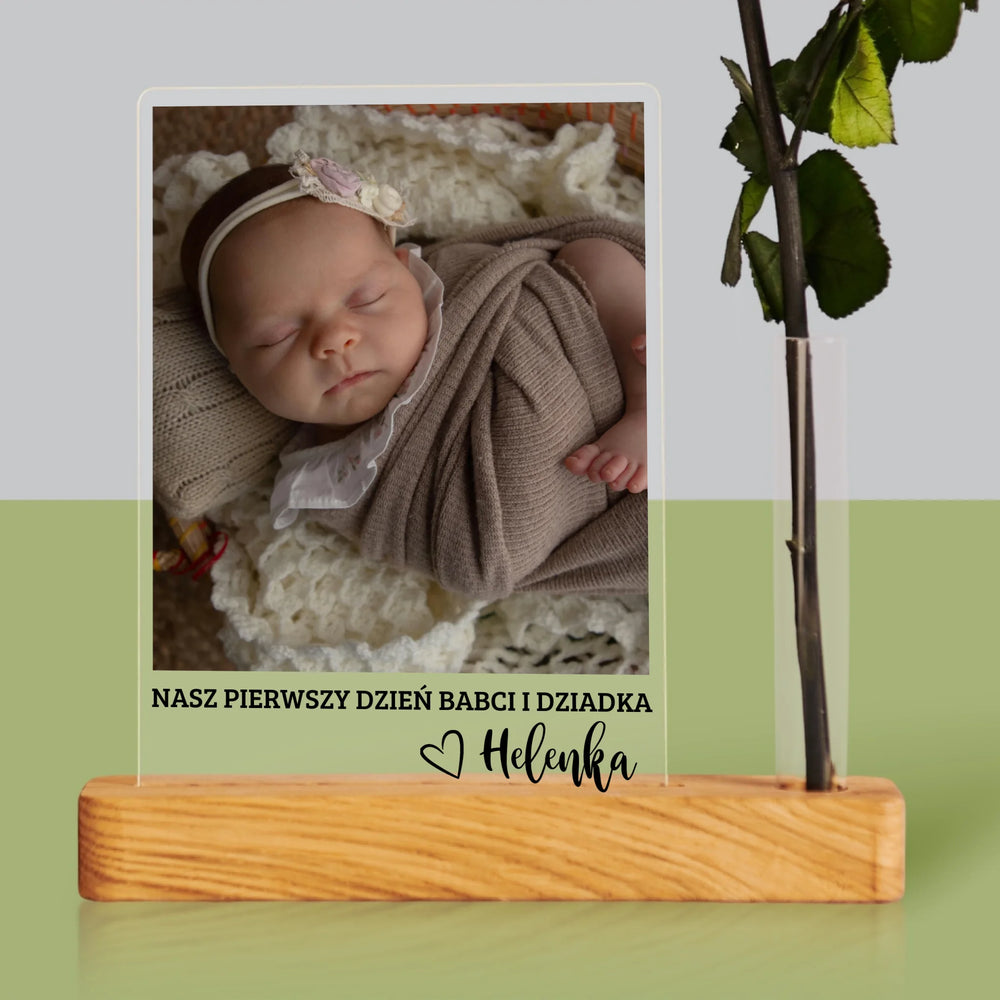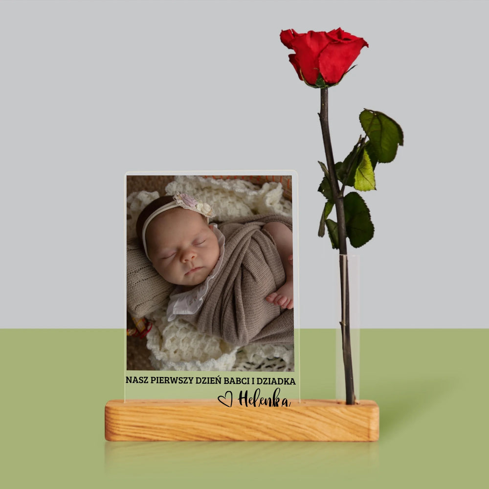 Zdjęcie i Podpis: Pierwszy Dzień Babci i Dziadka - Wydruk na szkle akrylowym z różą