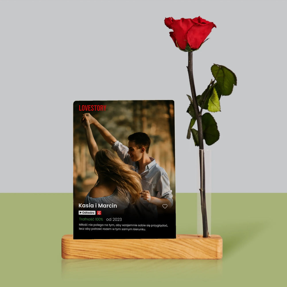 Dołączona róża w małym wazonie w kształcie probówki, umieszczonym w podstawce razem z wydrukiem na szkle akrylowym.