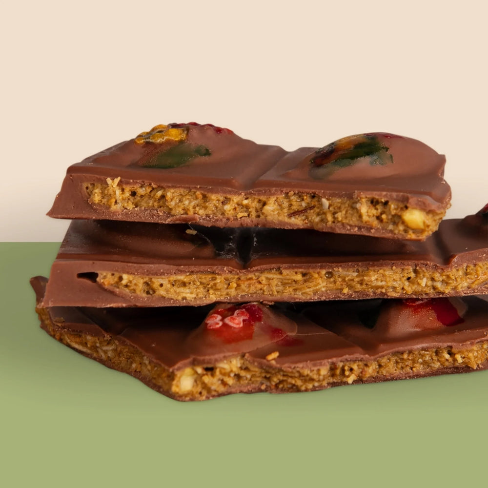 Nadzienie mlecznej czekolady składa się z pasty pistacjowej, ciasta kataifi oraz pasty Tahini.