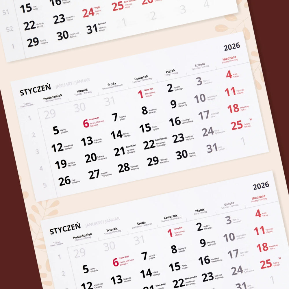 Kalendarz trójdzielny z wybranym przez Ciebie personalizowanym wzorem.