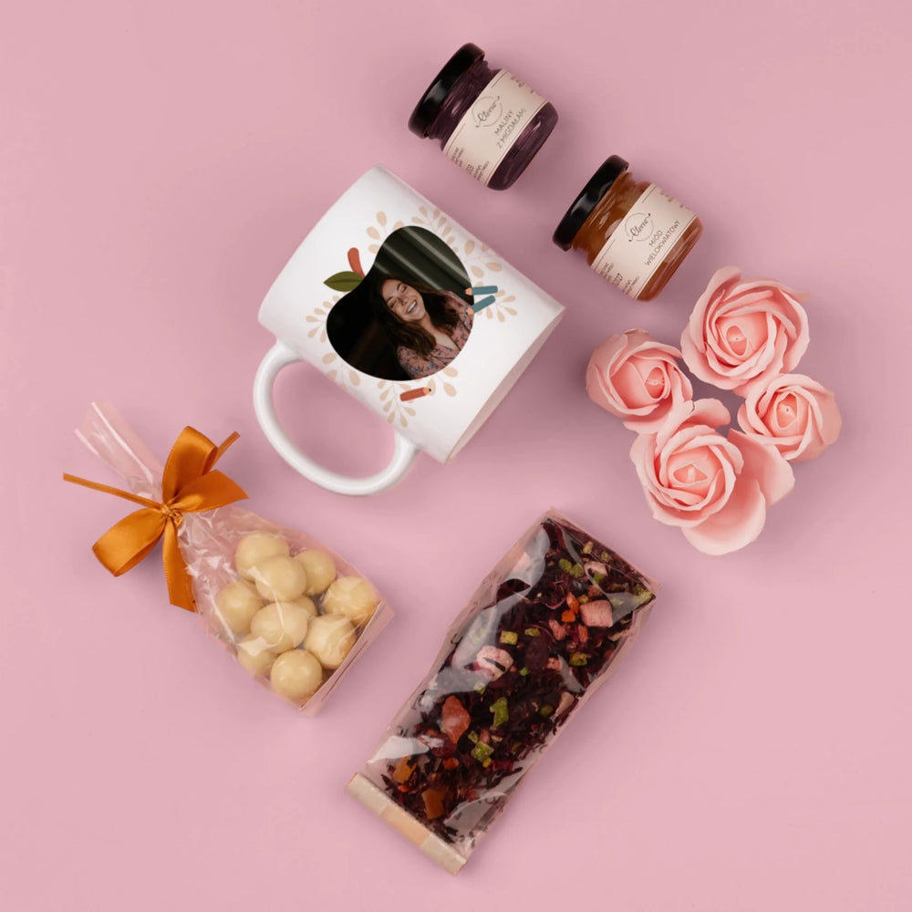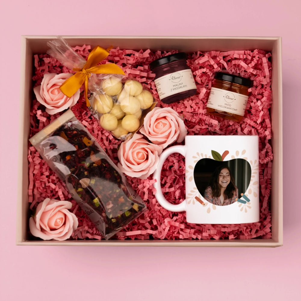 - Piękny zestaw prezentowy z kubkiem z wybraną przez Ciebie personalizacją oraz dodatkami - herbatą i słodkościami.