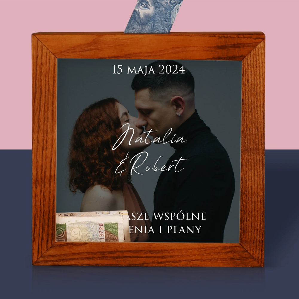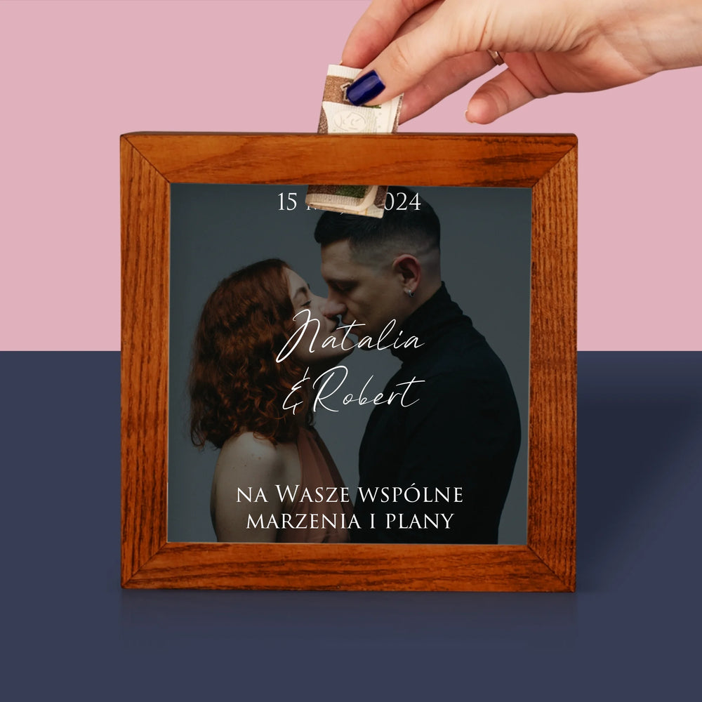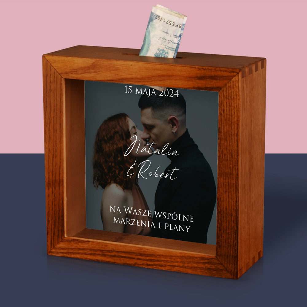 Zdjęcie I Podpis: Ślubne Zdjęcie Życzenia - Drewniana skarbonka