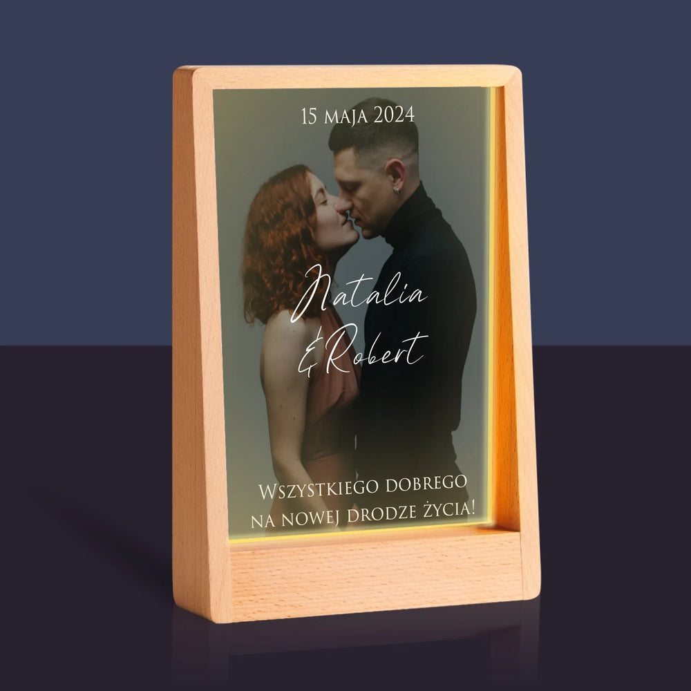 Zdjęcie i Podpis: Ślubne Zdjęcie Życzenia - Wydruk na szkle akrylowym w ramce LED