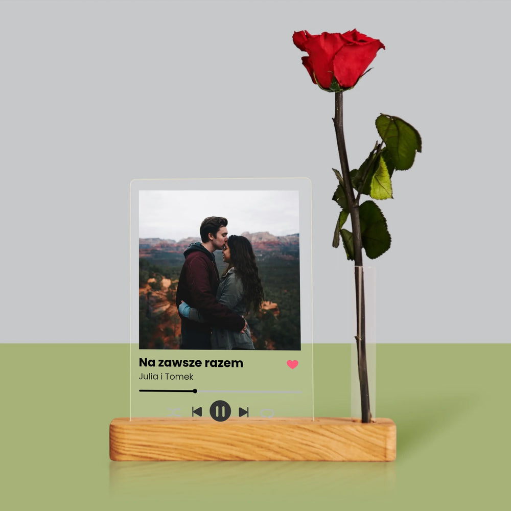 Dołączona róża w małym wazonie w kształcie probówki, umieszczonym w podstawce razem z wydrukiem na szkle akrylowym.