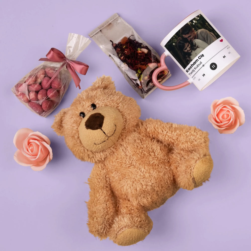 W zestawie znajdują się migdały w czekoladzie, herbata owocowa, róże mydlane oraz pluszowy miś.