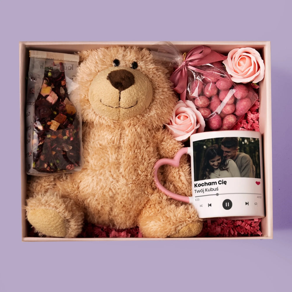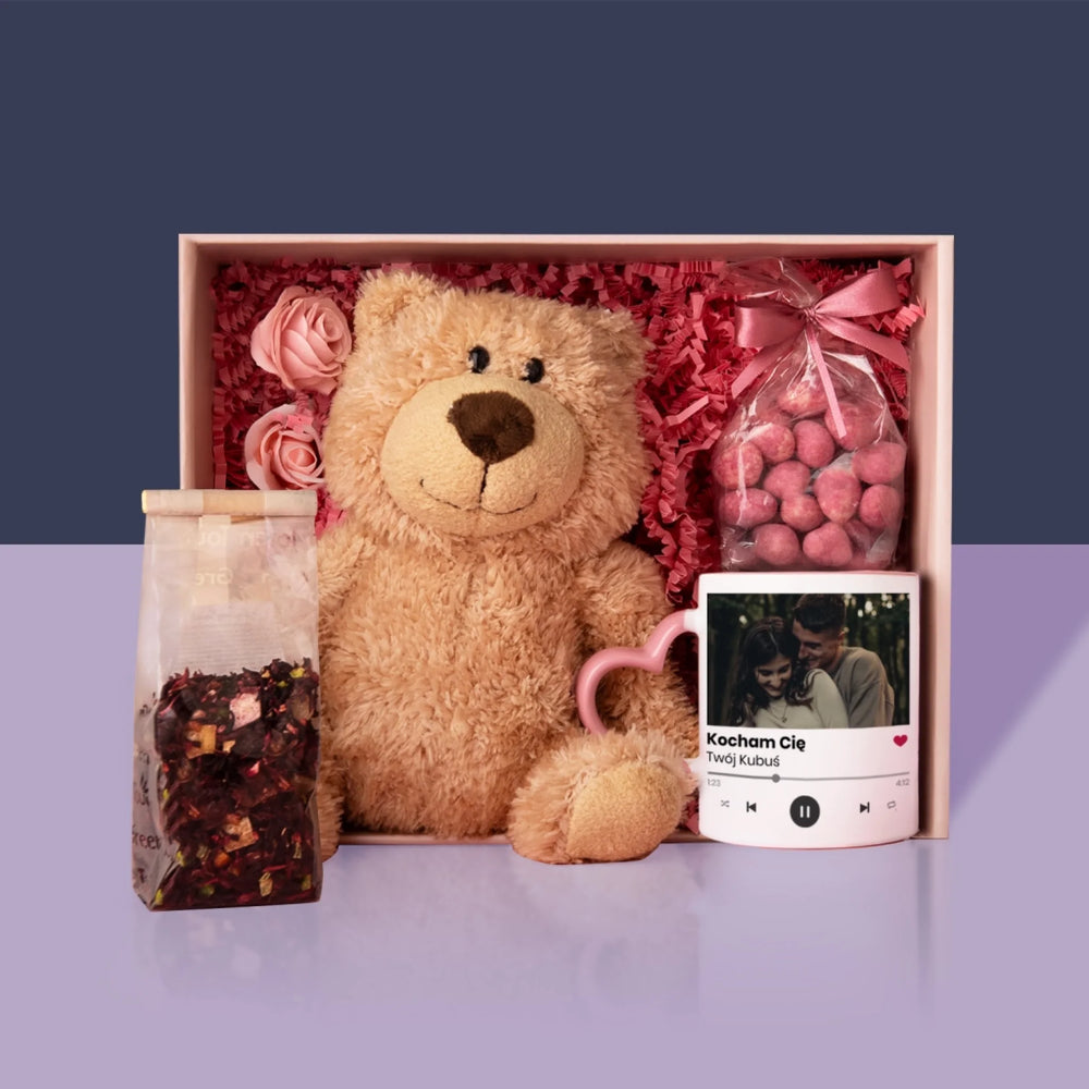 Piękny zestaw prezentowy z kubkiem z wybraną przez Ciebie personalizacją oraz uroczym misiem i słodkościami.